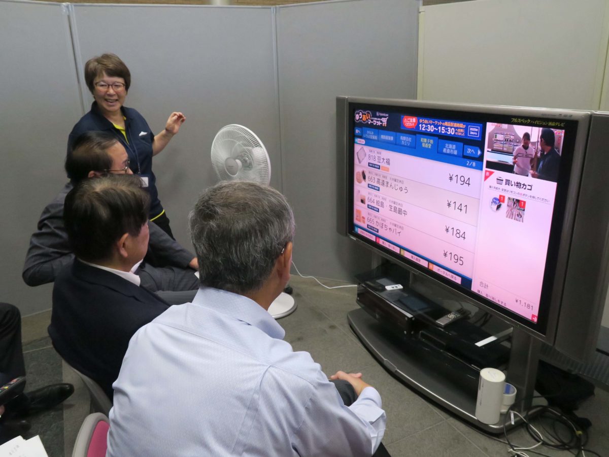 続いて、伊那市役所内において、ゆうあいマーケットと呼ばれる「ドローン物流」に関する映像を見るとともに、ケーブルテレビでの各家庭での商品注文の体験をさせて頂きました。