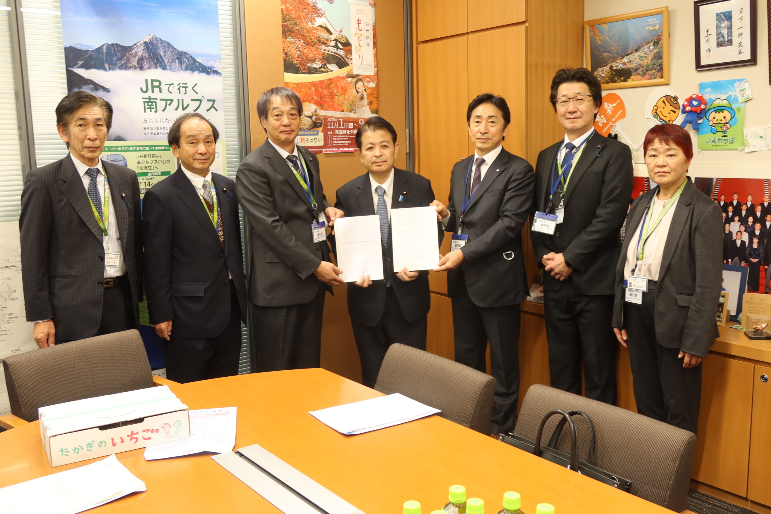 午前中には、喬木村の市瀬直史村長、喬木村議会の下平貢議長をはじめとする皆様から「三遠南信自動車道の建設促進及び地方道の更なる整備拡充・強化を求める要望書」をいただき、意見交換を行いました。