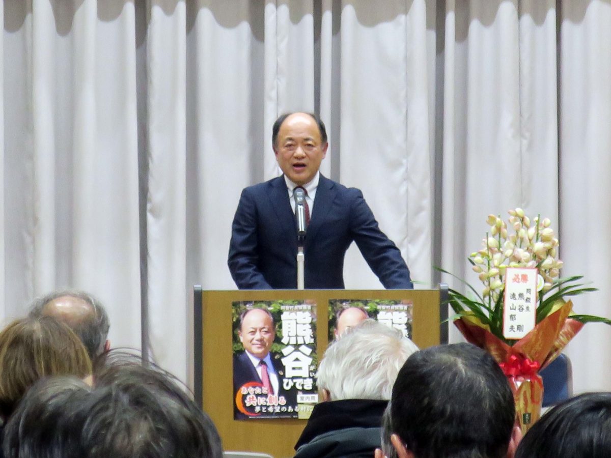 私からは、3期12年にわたり、日本一の星空や花桃などの地域資源を活かした観光や産業振興に実績を積み上げてこられた熊谷ひでき村長のリーダシップに心から敬意を表し、熊谷ひでき村長とともにリニア新時代に向けた阿智村の更なる発展に努力していくことをお約束し、熊谷ひでき村長を応援する後援の輪をさらに大きく広げていただくことをお願いして、激励のご挨拶を申し上げました。