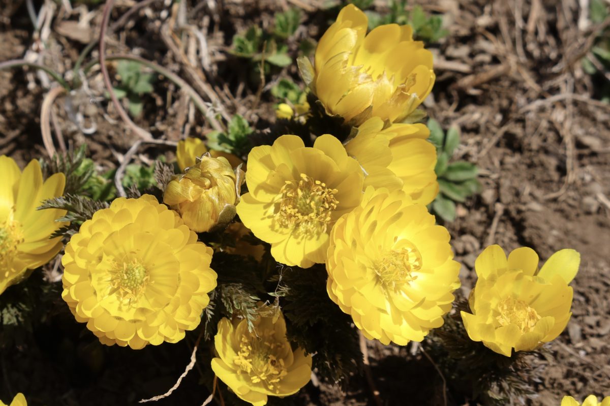 満開の一重の福寿草が並び、日の光りに照らされて輝いていました。