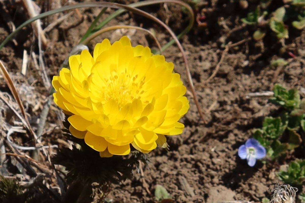 たんぽぽのような形をした福寿草と、かわいいイヌノフグリの青い花が並んで咲いていました。