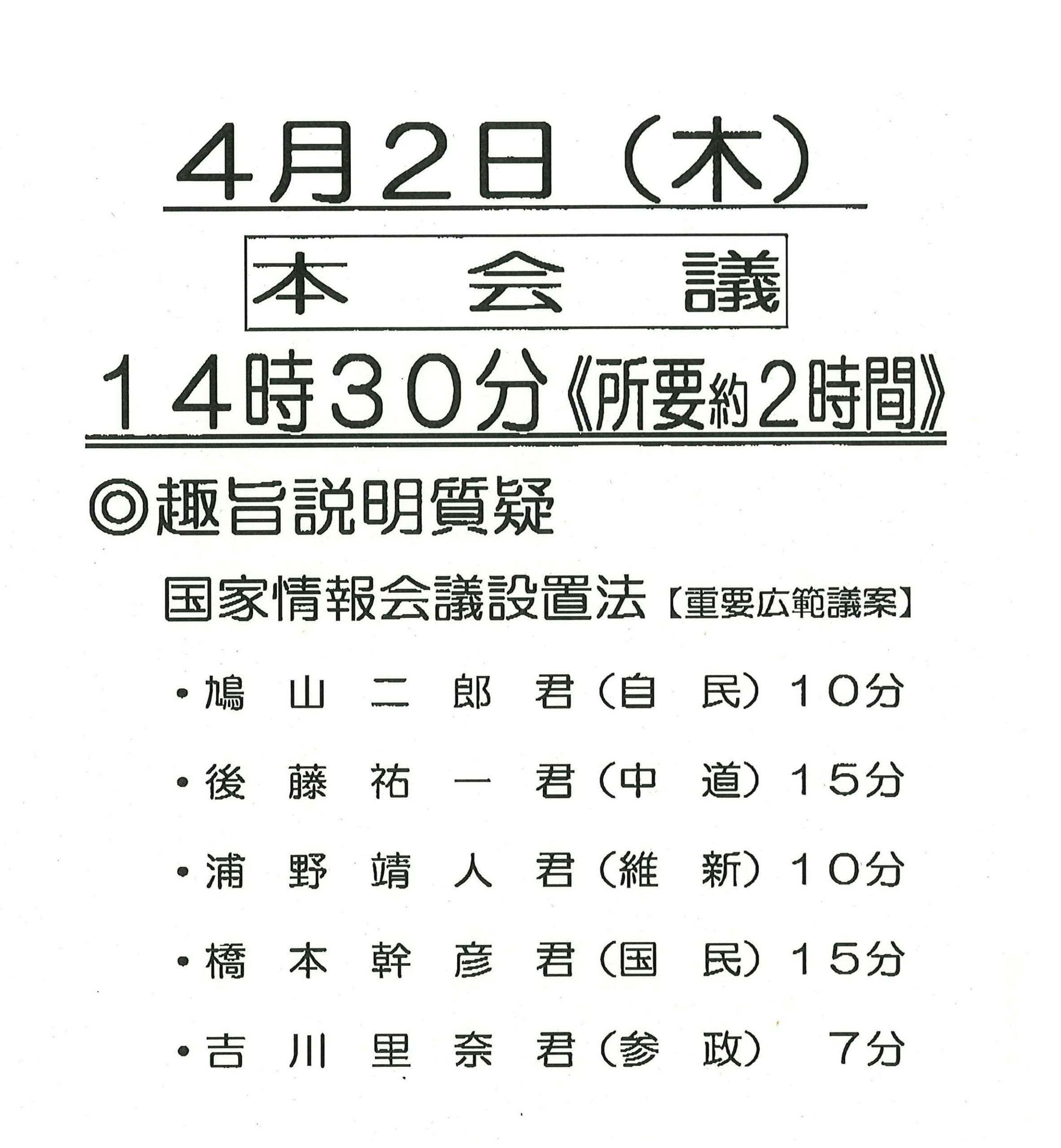 本日は、「国家情報会議設置法」の趣旨説明質疑が行われ、自民党からは、鳩山二郎先生が質問に立たれました。