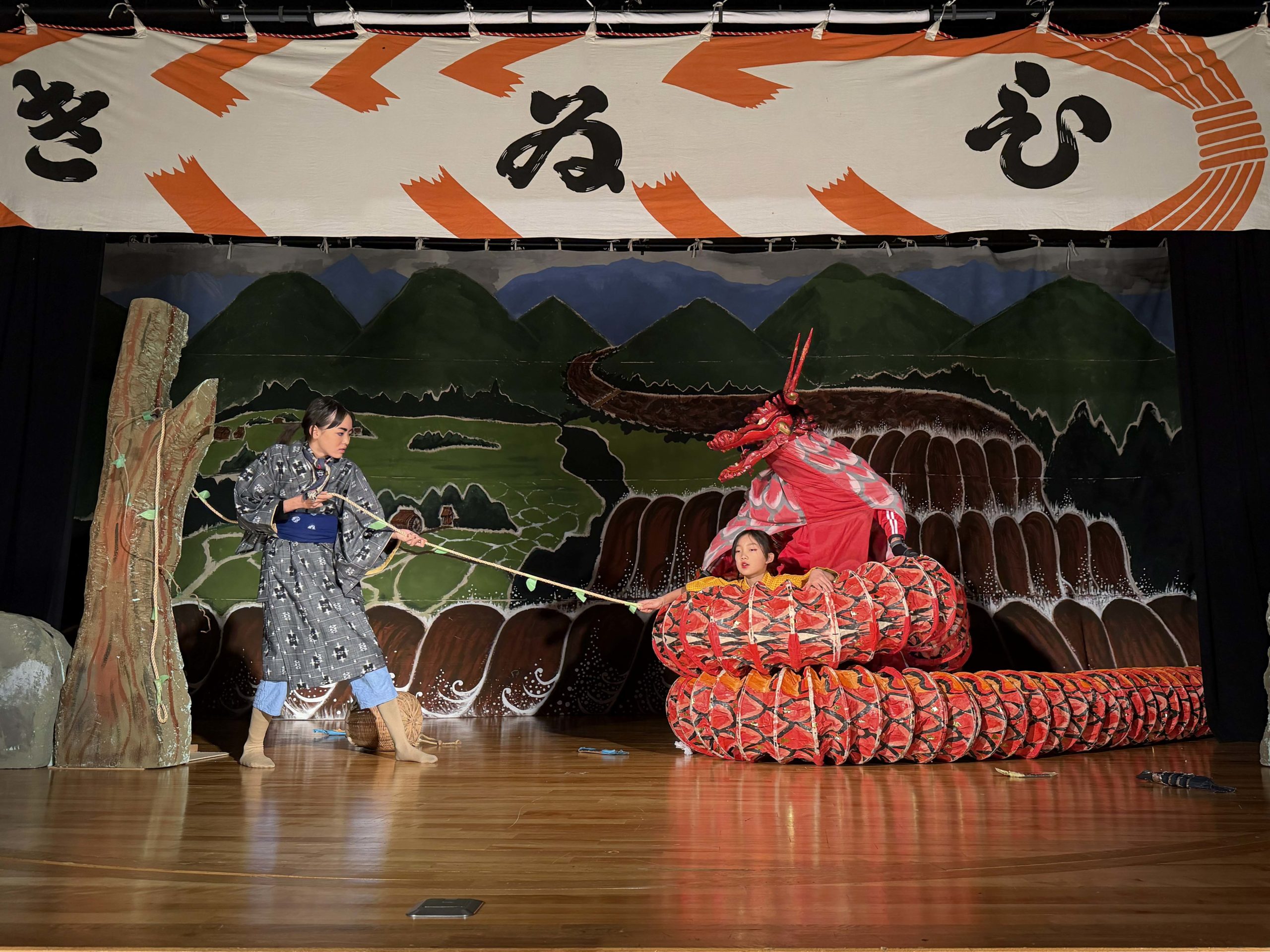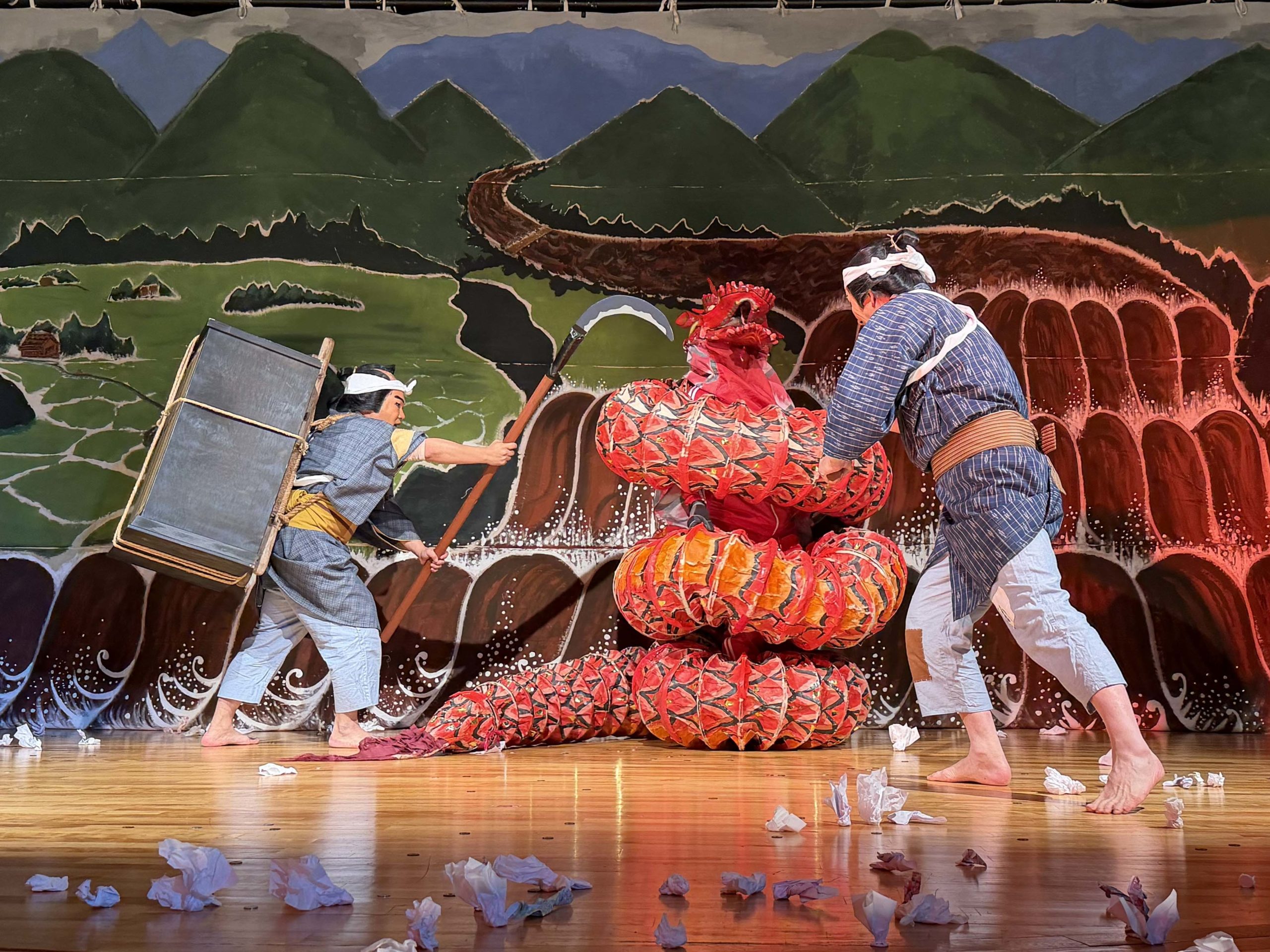 大蛇に打ち勝ち、見栄を切る忠勝と軍次です。