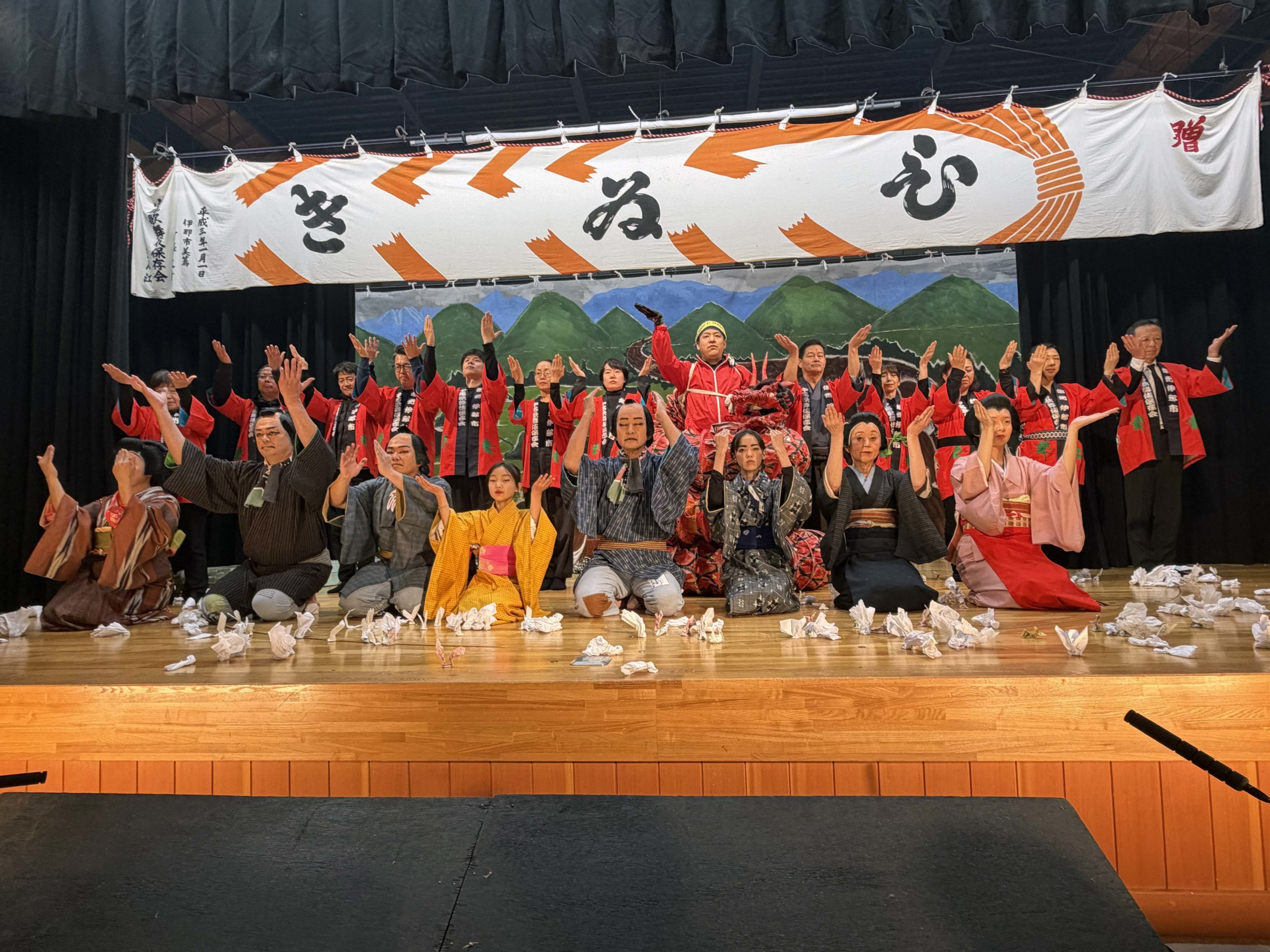 源蔵役を務めた国土交通省天龍川上流河川事務所の吉田佳治所長の音頭により、会場全員で中尾歌舞伎の万歳三唱を行いました。