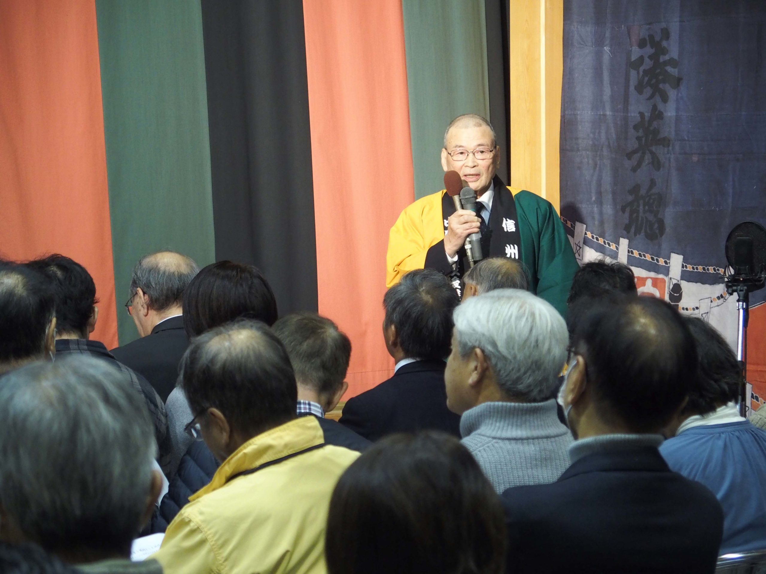 開演前に、伊那中尾歌舞伎後援会の松田泰俊会長から、ご挨拶と本日の演目である「三六災害半世紀」の公演に至る経緯などについてお話がありました。