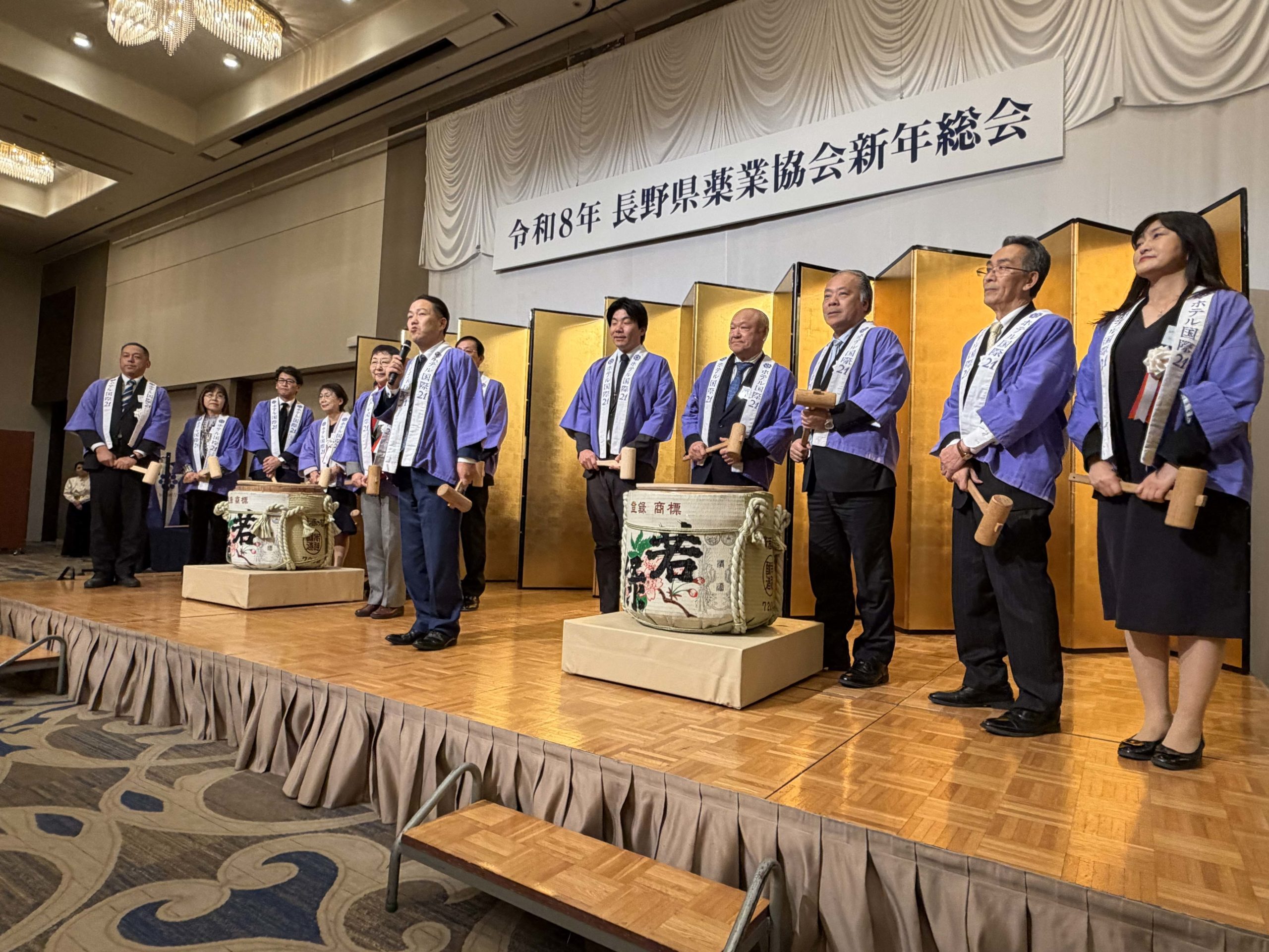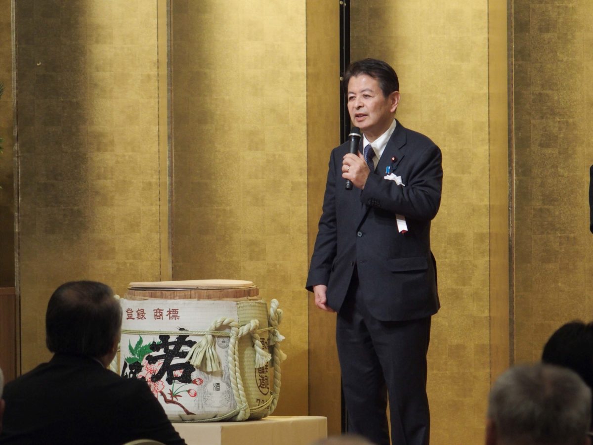 出席された長野県議会議員の先生方が壇上に上がり、鏡開きが行われました。県議の先生方を代表して西沢正隆先生がお祝いのご挨拶を述べられました。