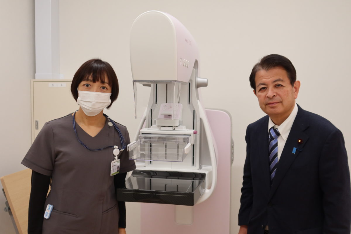 始めに、中部公衆医学研究所の皆様にご案内を頂きながら、施設検診・人間ドックなどの最新の検査設備を備えた1階の「南信州健診センター」のフロアを見学しました。写真は、最新のマンモグラフィー検査装置です。