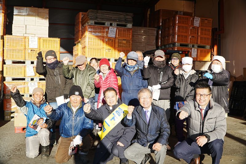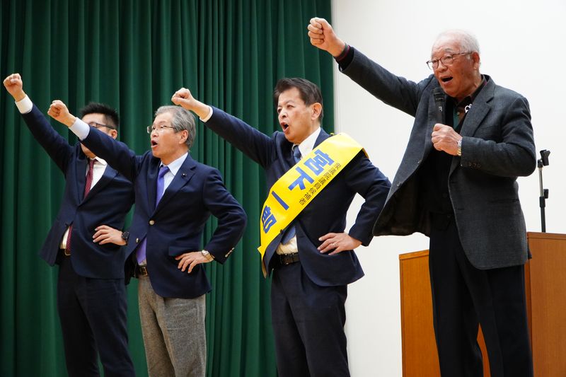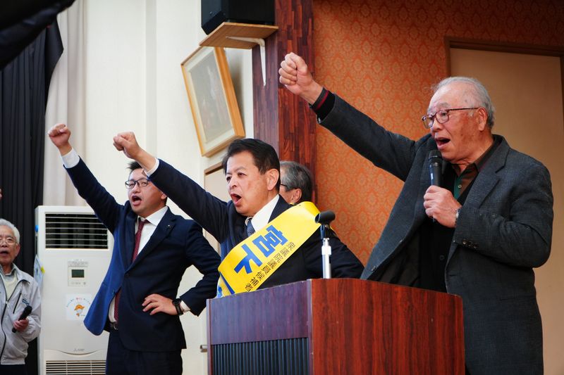 宮下一郎から、リニア中央新幹線や三遠南信自動車道など、道路交通網整備を進め、伊那谷の新時代を切り拓く決意を表明し、皆さまと必勝を誓い「勝つぞコール」を行いました。