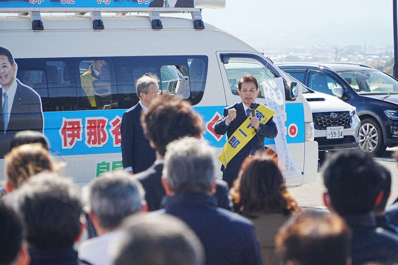 リニア中央新幹線や三遠南信自動車道の開業を控える伊那谷の発展をエンジンに、高市早苗総理と力を合わせ、日本列島を強く豊かにするため全力で取組んで行くことを申し上げ、この選挙戦の絶対勝利を誓いました。