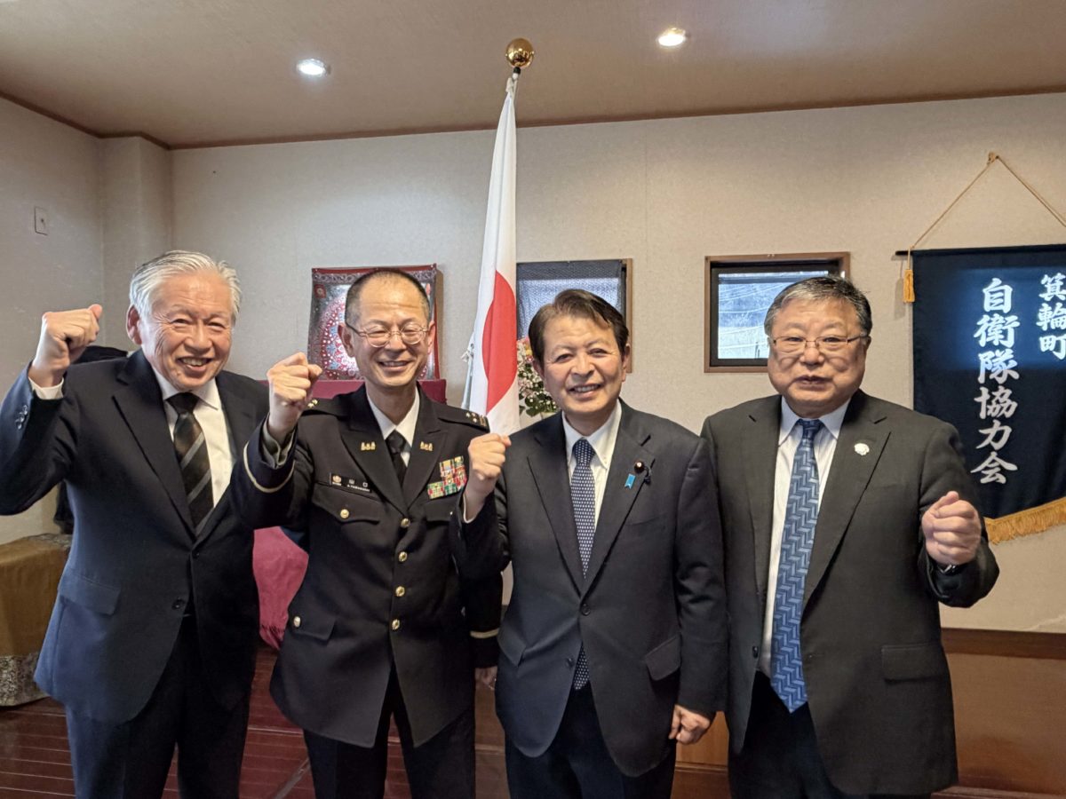 懇親会での記念写真です。右から、箕輪町の白鳥政徳町長、私、自衛隊長野地方協力本部の山口敦史本部長、箕輪町自衛隊協力会の木村英雄会長です。
