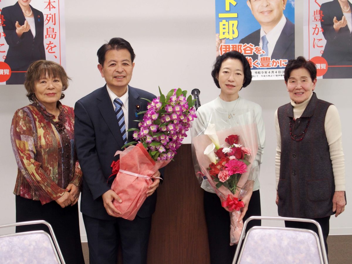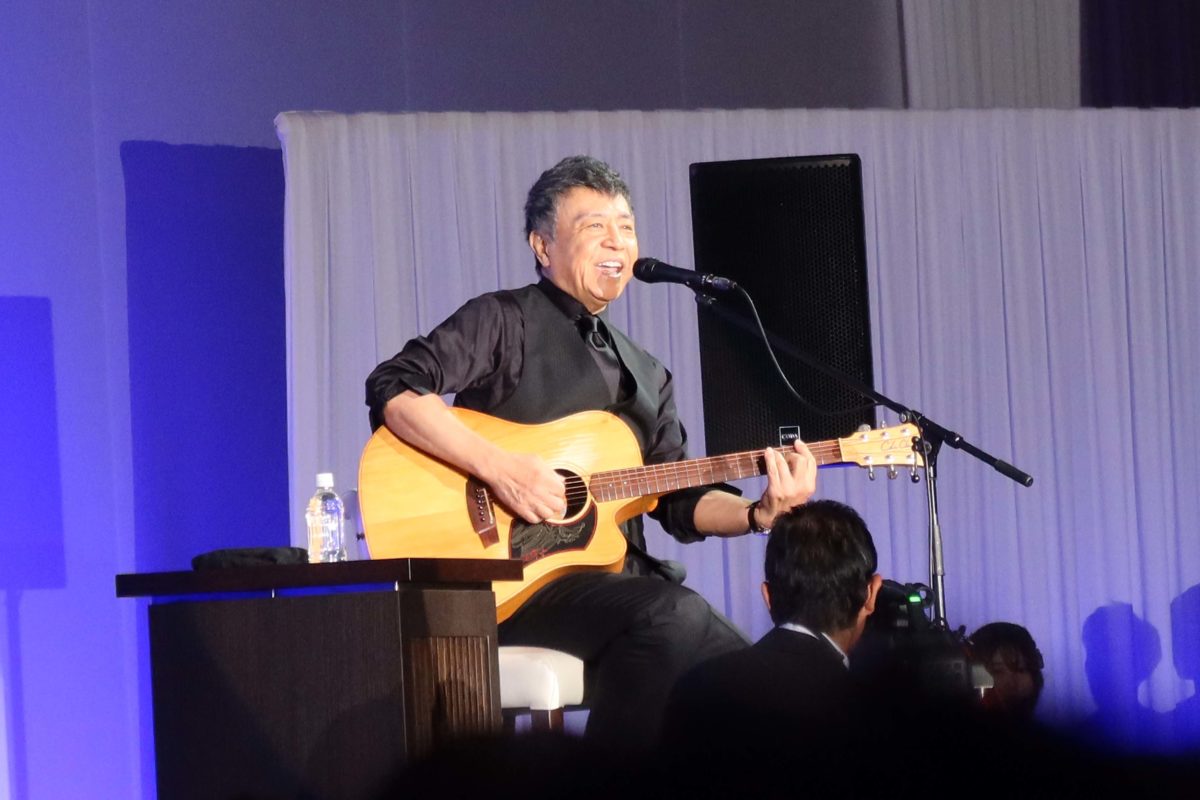 続いて、ミュージシャンの世良公則さんから自民党に対する激励のスピーチと演奏が披露されました。特に、「燃えろいい女」の演奏では、会場の皆さんと「燃えろサナエ」と歌い、大いに盛り上がりました。
