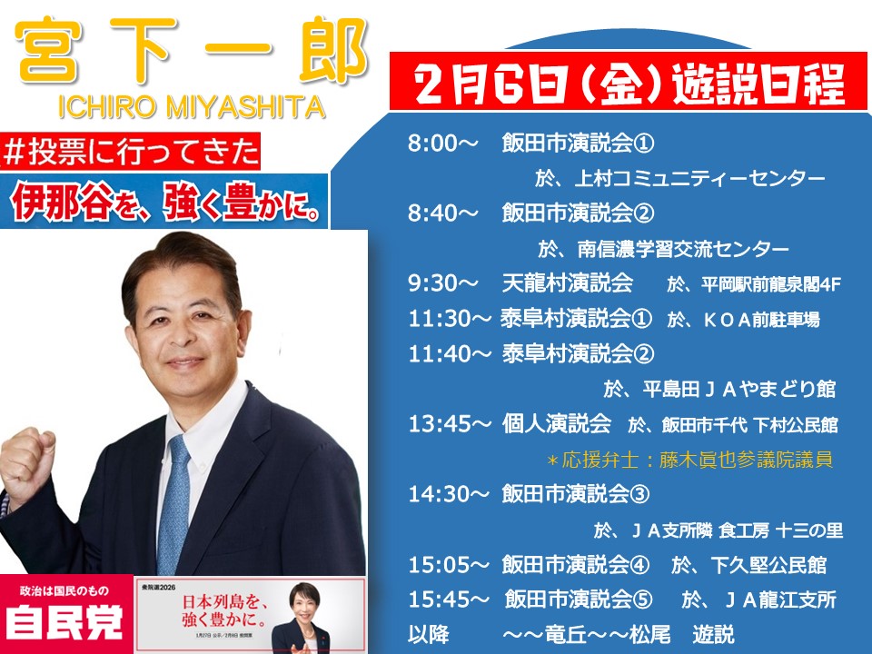 (秘書です)2月5日、衆議院選挙の10日目は、伊那市・宮田村・駒ヶ根市・飯島町・中川村で遊説を行い、阿南町で下伊那南部地区総決起集会を開催しました。