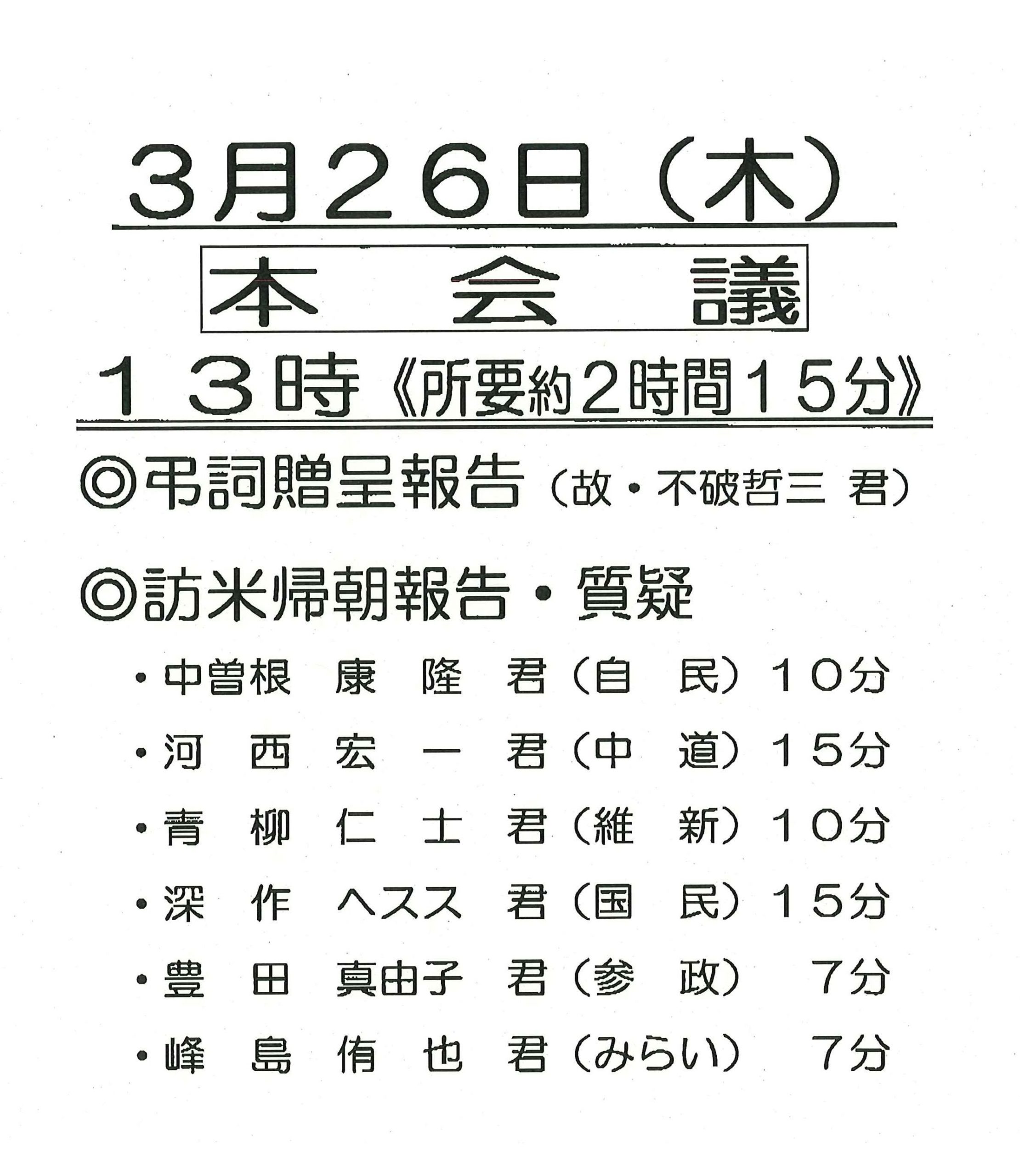 3月26日は、農業構造転換推進委員会役員会、資産運用立国議連総会、日本・イラン友好議連総会、農林役員会、衆議院本会議、砂防事業促進議連役員懇談会に出席しました。