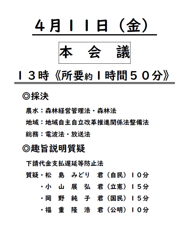本日は、「森林経営管理法・森林法」、「地域自主自立改革推進関係法整備法」、「電波法・放送法」について採決が行われ、いずれも賛成多数で可決しました。