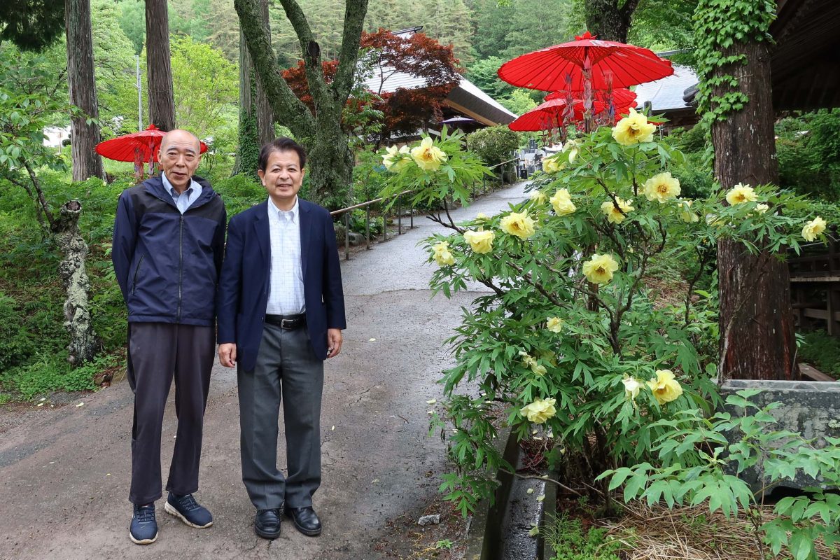 「高遠のぼたん寺」として有名な伊那市高遠町の遠照寺では松井教一住職にお会いしてお話を伺うことが出来ました。境内では、ちょうど黄色のぼたんがきれいにさいていました。