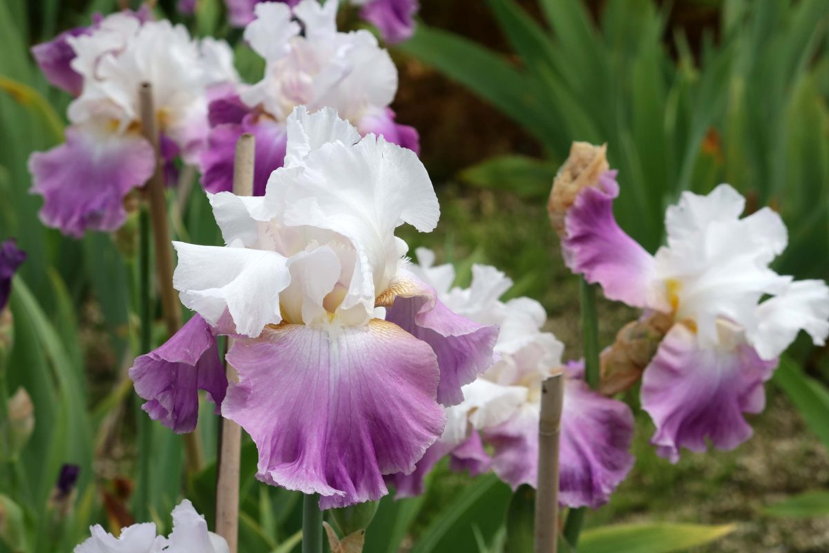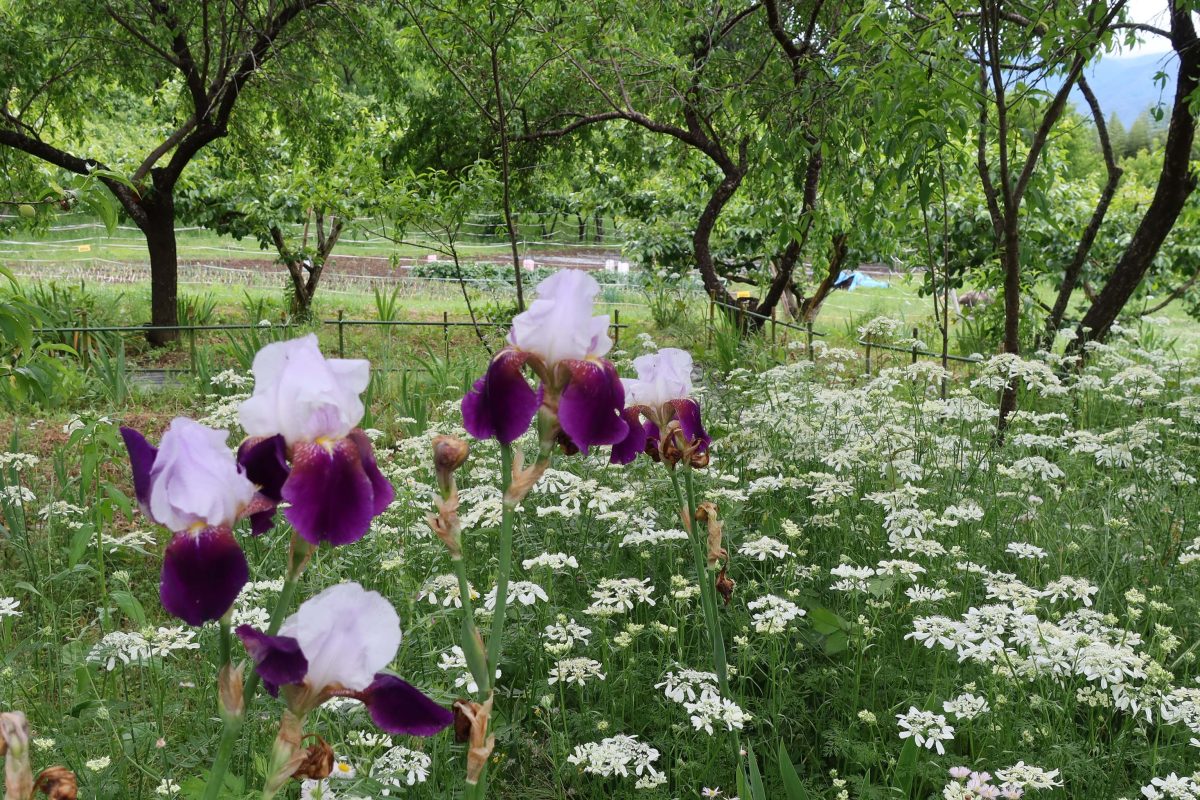 緑の中に咲くアイリスと白いオルレアの花がとてもきれいでした。
