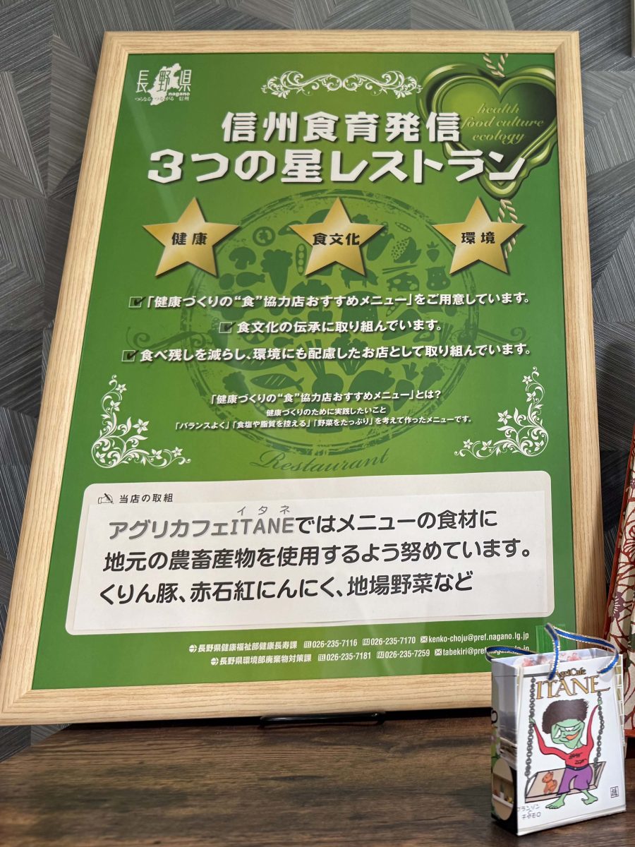お店では、健康づくり、食文化の伝承、食べ残し削減に取り組む「信州食育発信3つの星レストラン」の認証を長野県から受けているそうです。