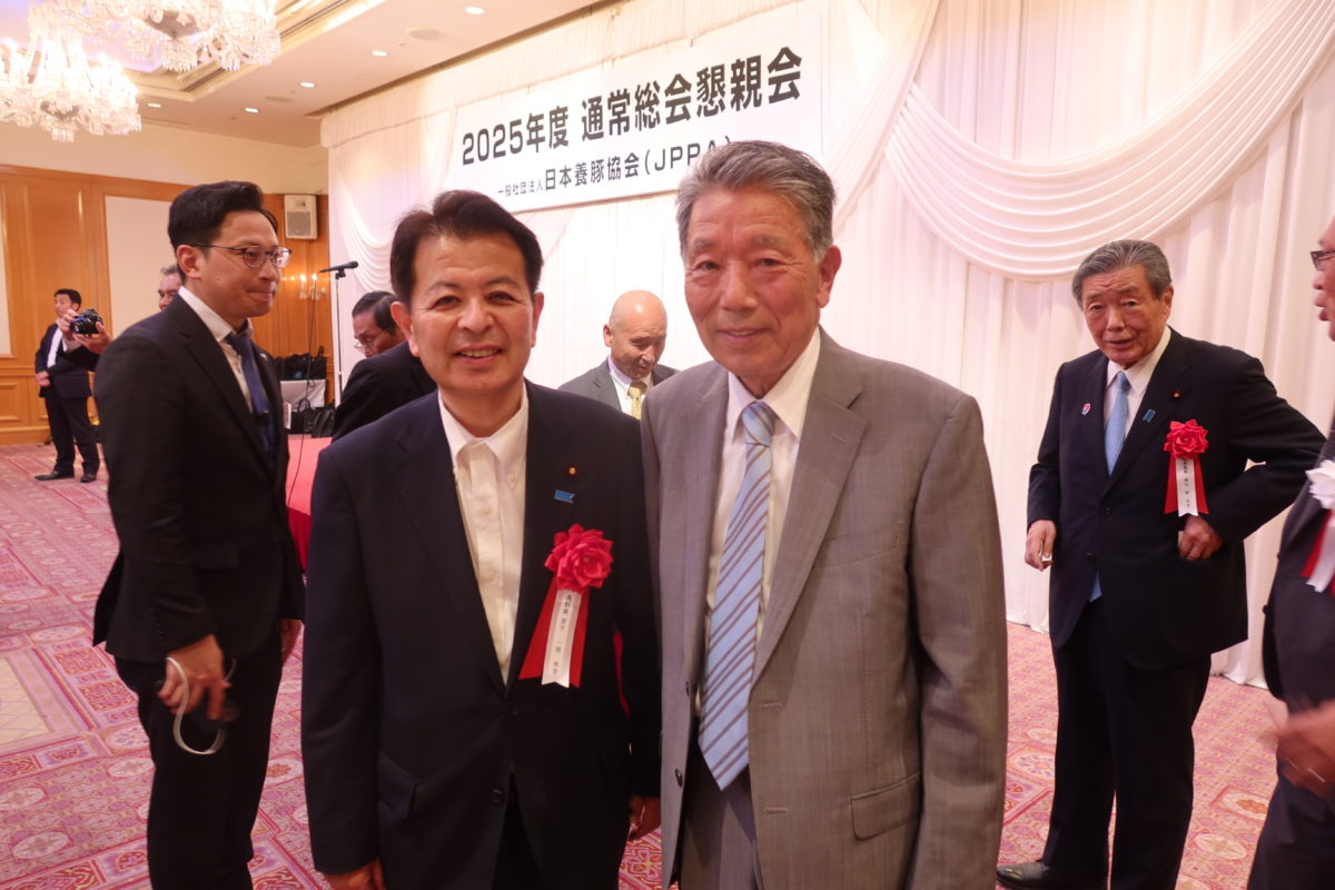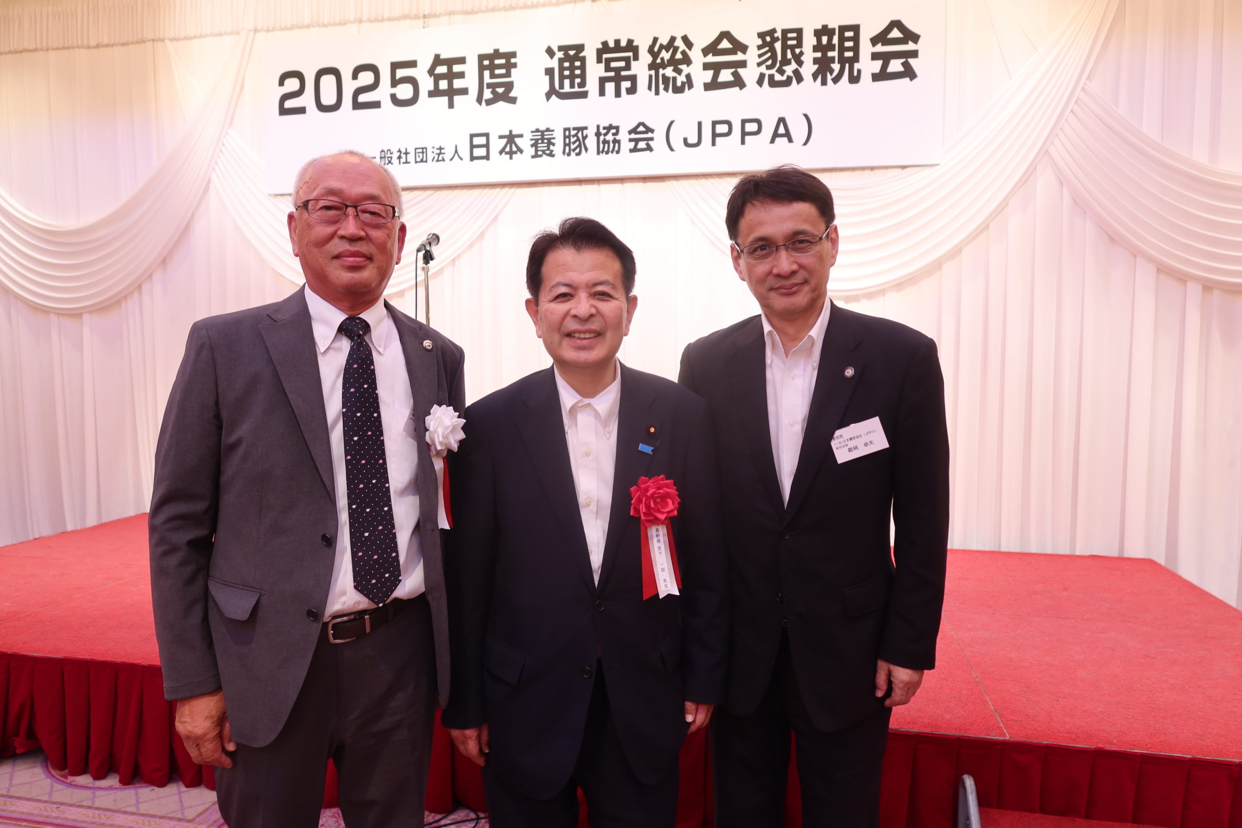 日本養豚協会の香川雅彦会長、鋤柄卓夫専務理事との記念撮影です。