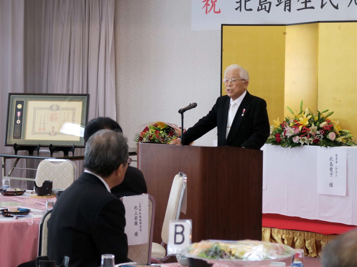 祝辞挨拶において、私から、北島靖生さんの栄誉あるご受章に心から御祝い申し上げるとともに、様々な立場で地域や社会に大きくご貢献を頂きましたことに敬意と感謝を申し上げました。