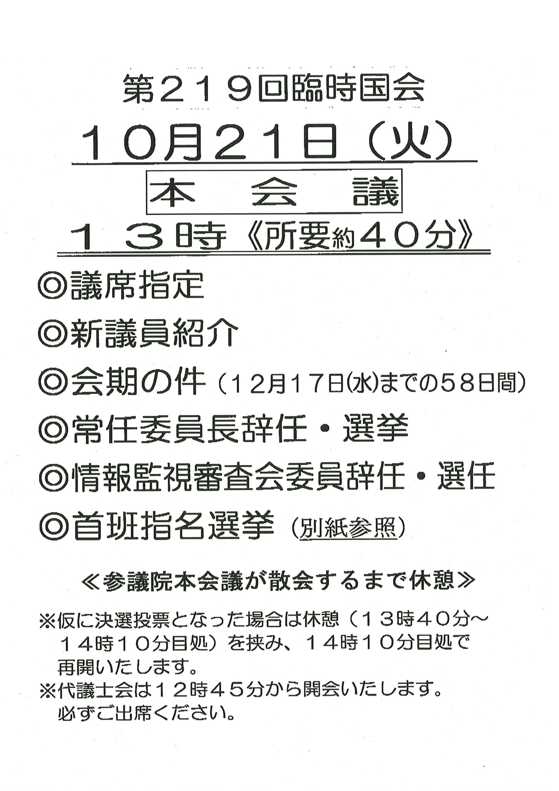 本日は、「議席指定」「会期の決定」「常任委員長辞任・選挙」「情報監視審査会委員辞任・選任」が行われ、引き続いて「首班指名選挙」が行われました。