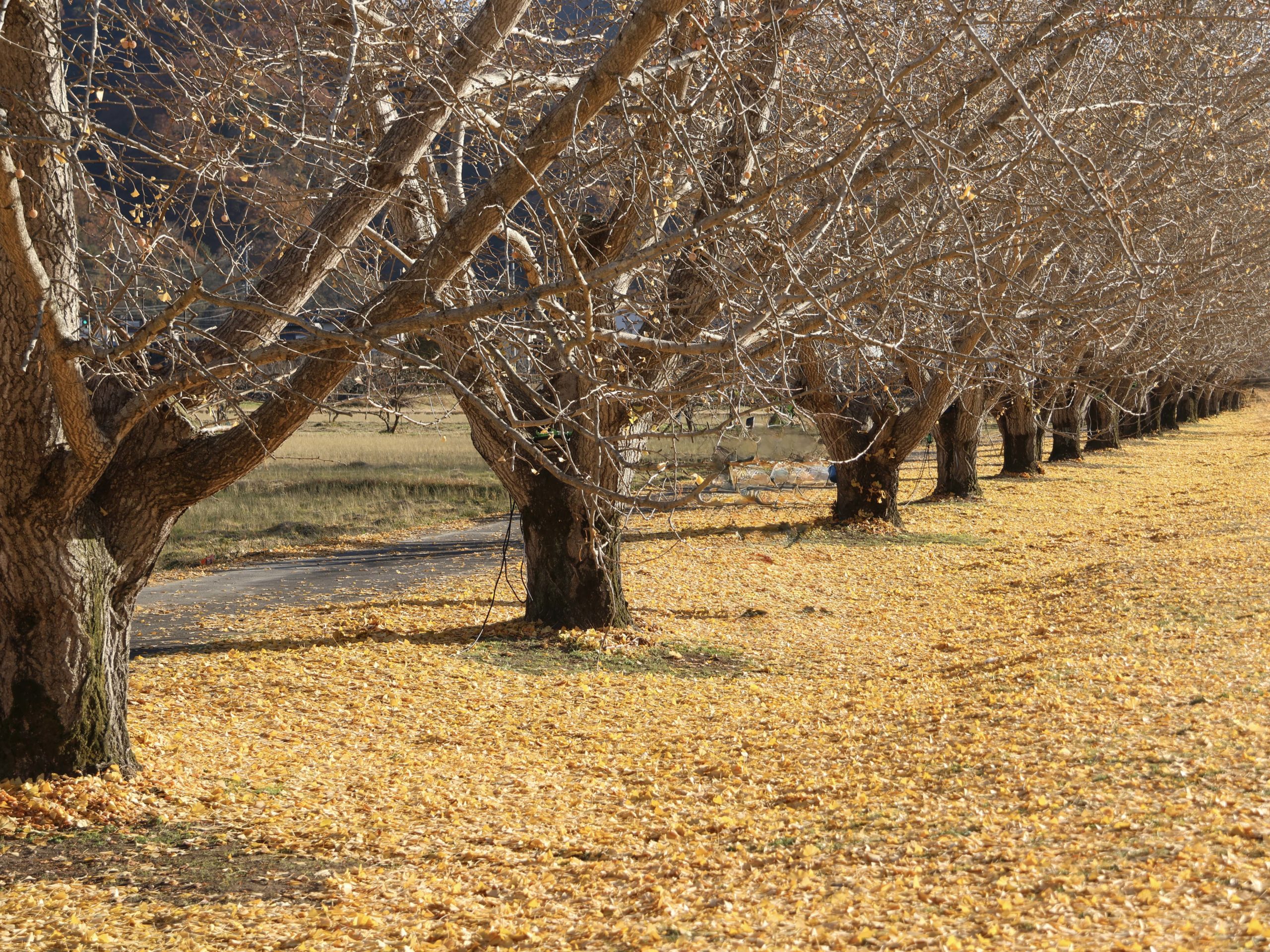 午後からは、中川村を訪問し、渡場のイチョウ並木など、村内で秋の風景を撮影しました。渡場のイチョウの葉はほぼすべて落ちていましたが、足元には、落ち葉が金色に輝く絨毯のように広がっていました。