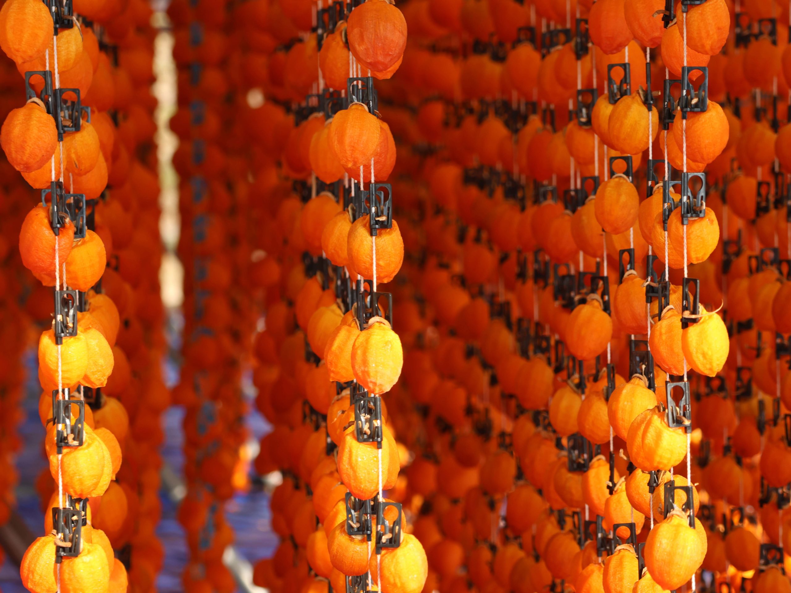 市田柿の乾燥用のハウスには、多くの柿が整然と並んでいました。