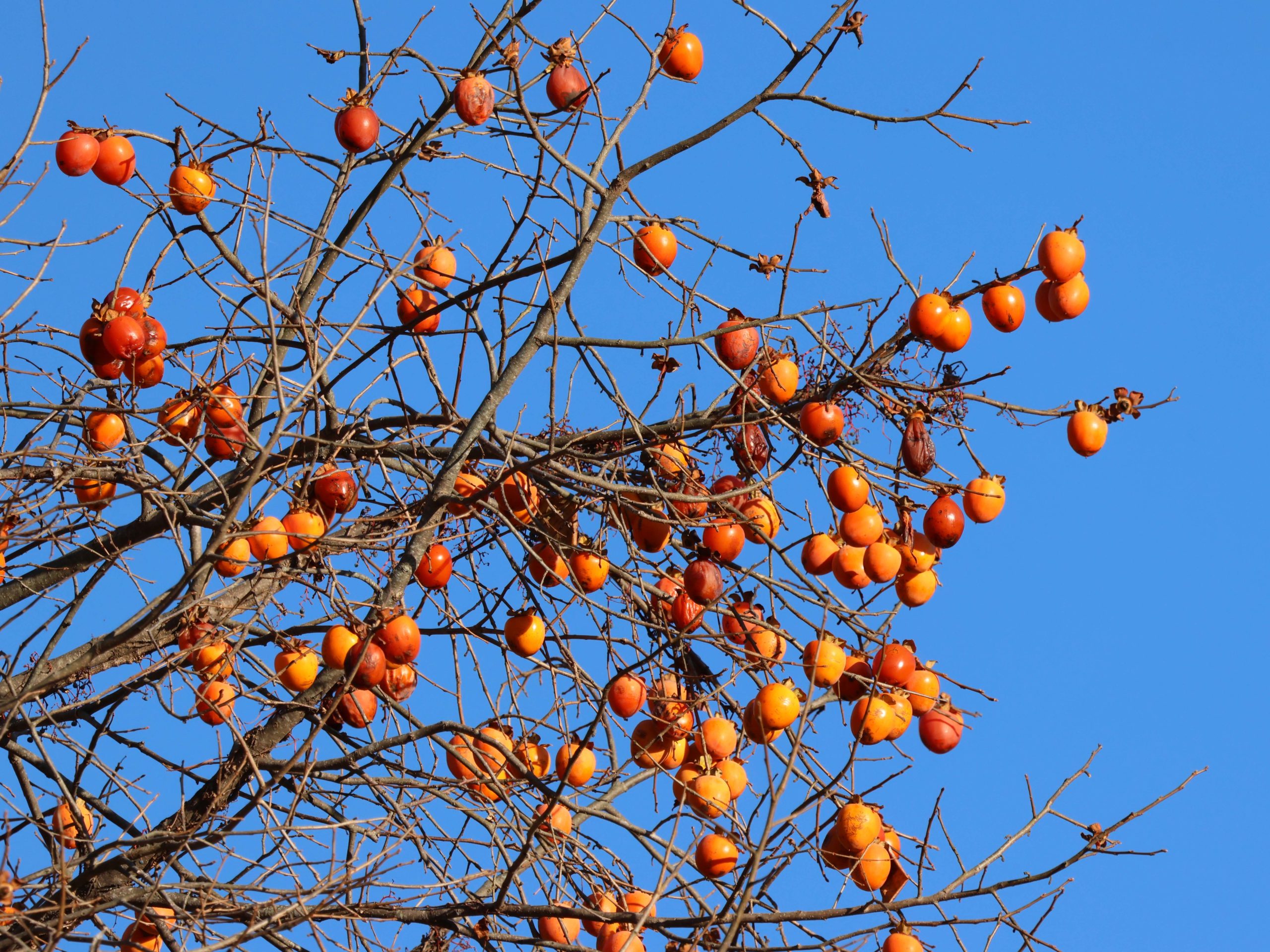 青空をバックに、赤やオレンジ色の柿が光っていました。