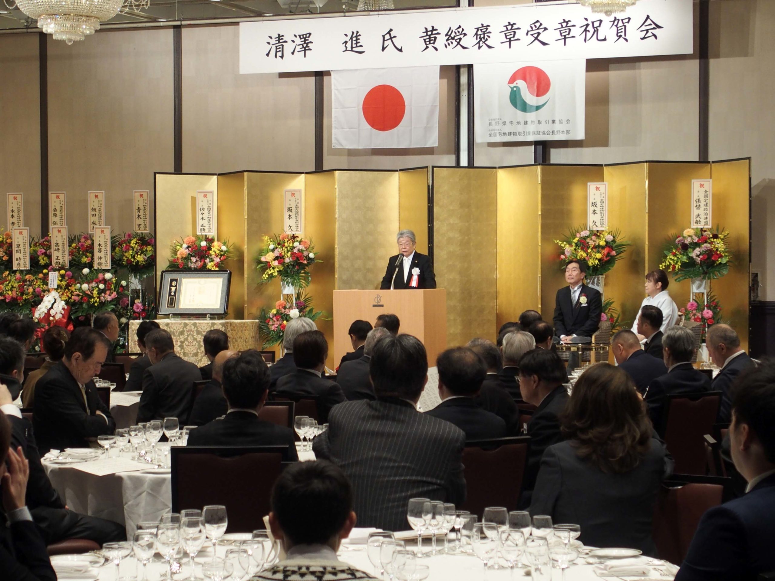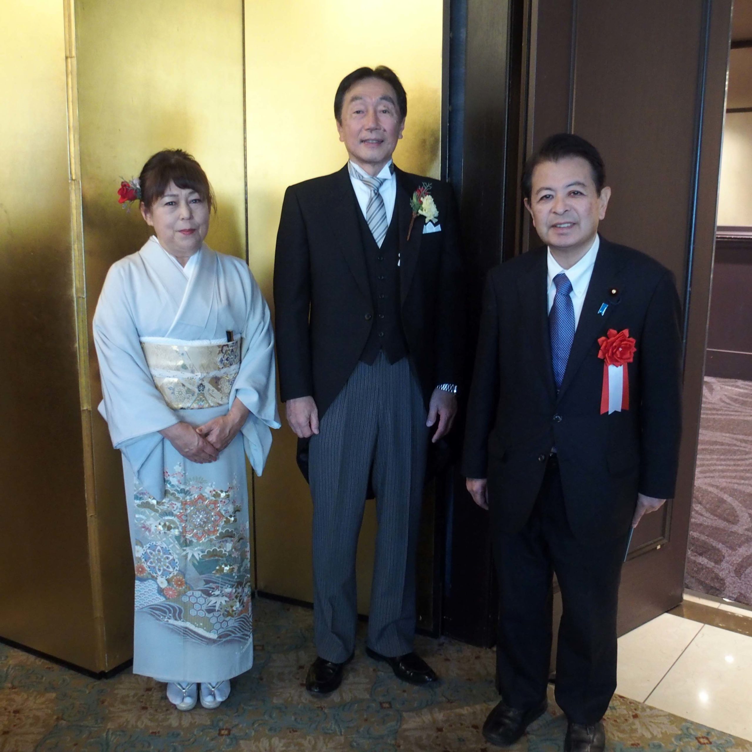 午前11時30分からは、松本市において、「長野県宅地建物取引業協会会長清澤進氏黄綬褒章受章祝賀会」に出席しました。写真は、祝賀会開会前に、清澤会長ご夫妻と記念に撮影したものです。