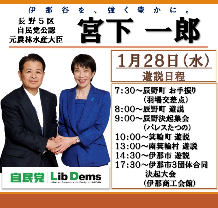 (秘書です)衆議院選挙公示日の1月27日は、伊那市・駒ヶ根市・飯田市での出陣式に出席しました。