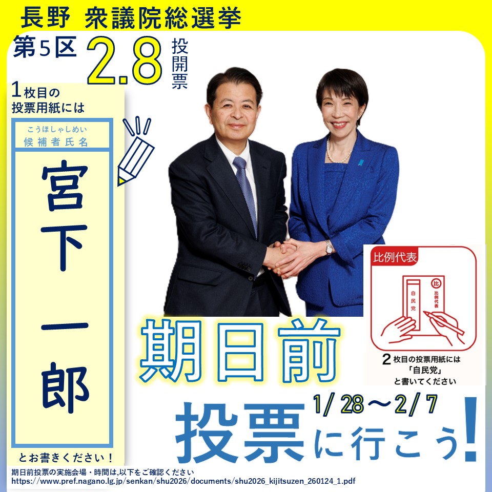 ぜひ、期日前投票を利用いただき、宮下一郎へ皆さまの貴重な一票を賜りますよう、宜しくお願いします。