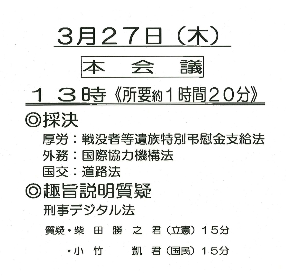 本日は、「戦没者等遺族特別弔慰金支給法」、「国際協力機構法」、「道路法」の採決を行ない、いずれも賛成多数で可決されました。続いて、「刑事デジタル法」の趣旨説明質疑が行われました。
