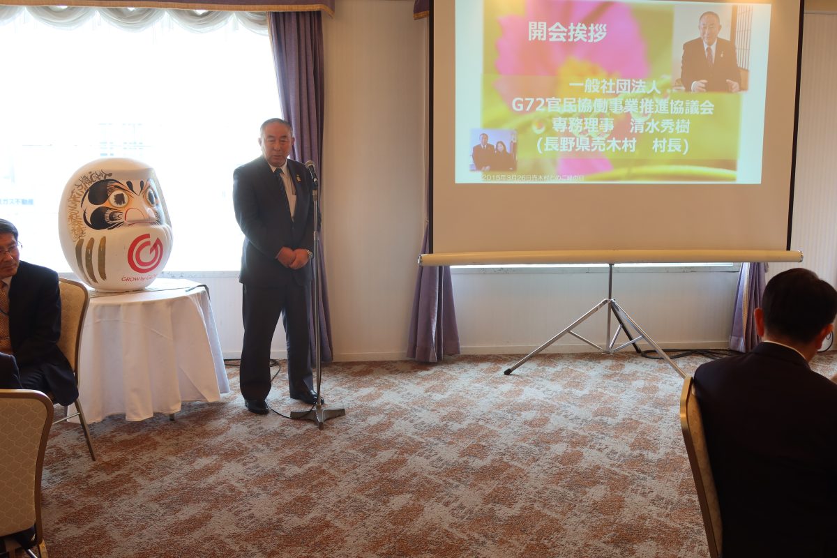 式のはじめに、G72官民協働事業推進協議会の専務理事である清水秀樹売木村長からご挨拶がありました。