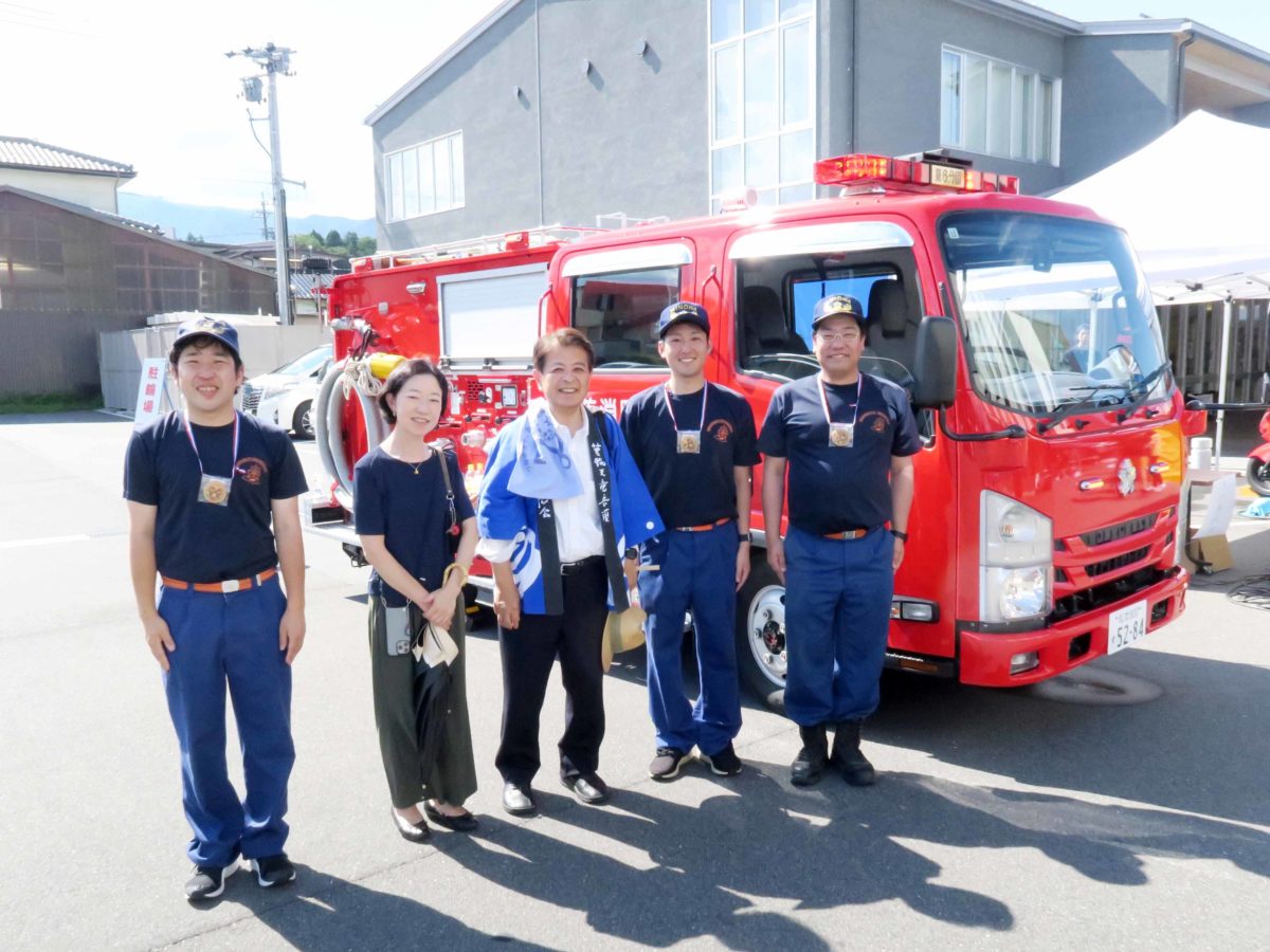 消防団の皆様は、消防車の展示や消火体験、煙体験などのコーナーを開いていました。