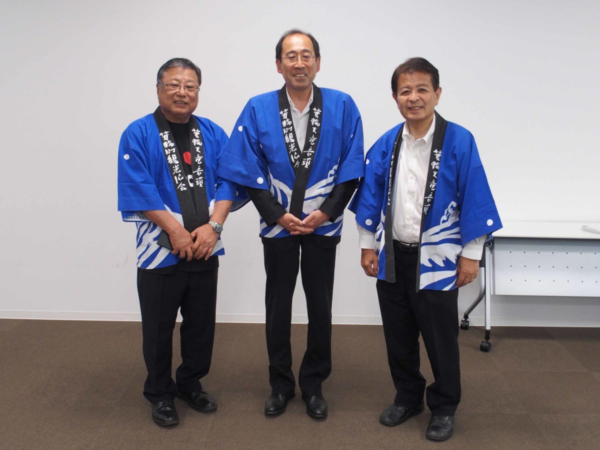 愛知県光田町の成瀬敦町長を囲んで、箕輪町の白鳥政徳町長と記念撮影をしました。