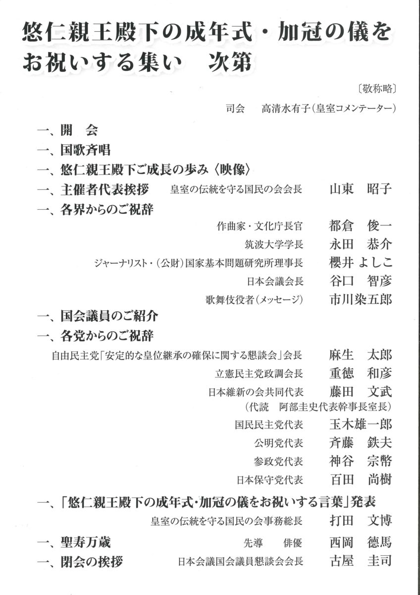 悠仁親王殿下の成年式・加冠の儀をお祝いする会の式次第です。