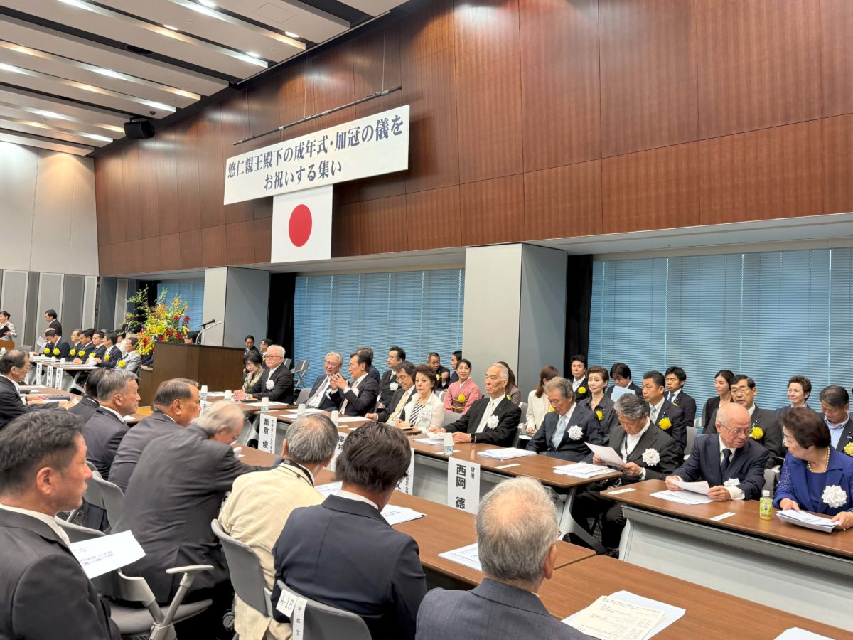 引き続いて、皇室の伝統を守る国民の会の打田文博事務総長から「悠仁親王殿下の成年式・加冠の儀をお祝いする言葉」の発表があり、俳優の西岡徳馬さんの先導による聖寿万歳が行われました。
