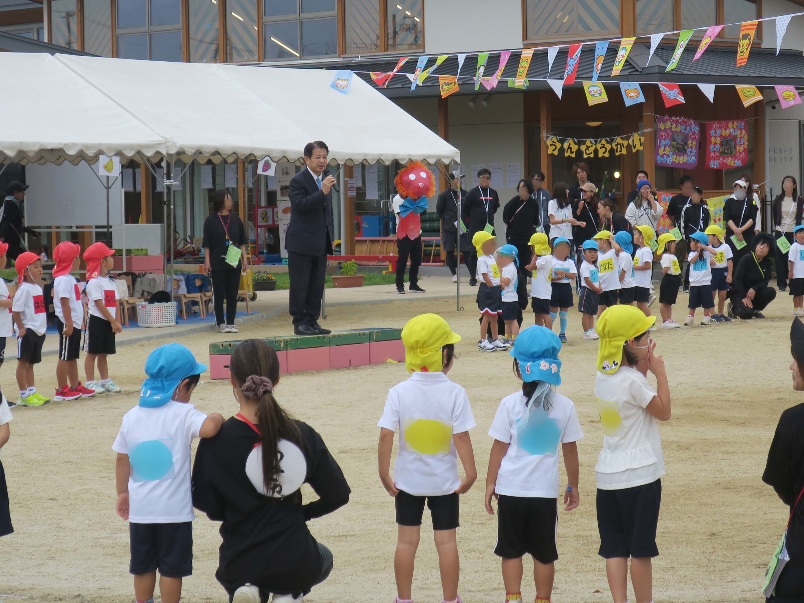 来賓祝辞において、私から、園児の皆さんに、思い出に残る運動会になるようがんばってください、とご挨拶しました。