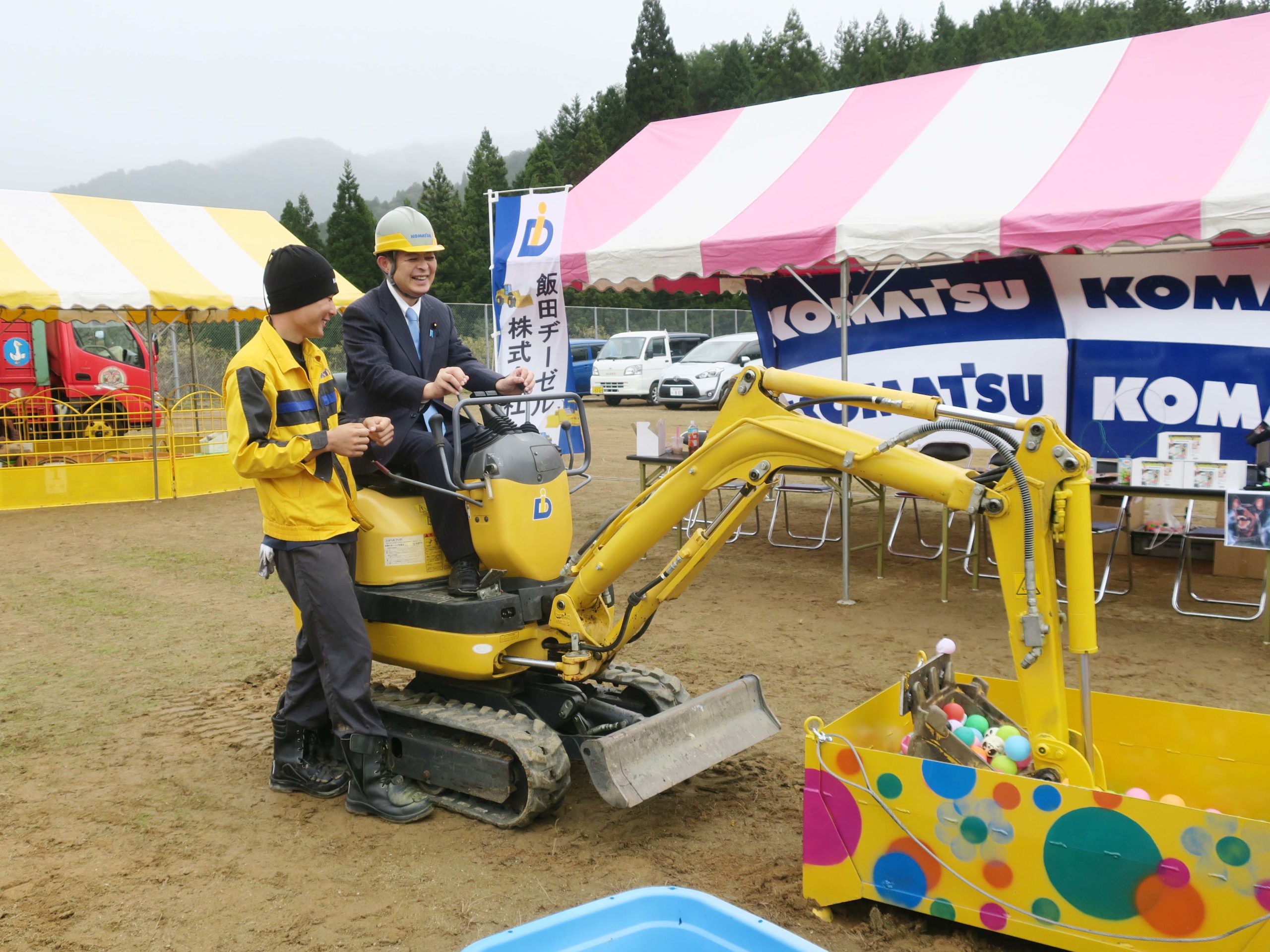 ミニショベルの操作体験コーナーでは、レバーを操作してボールをすくい、隣の箱に移す作業を体験しました。