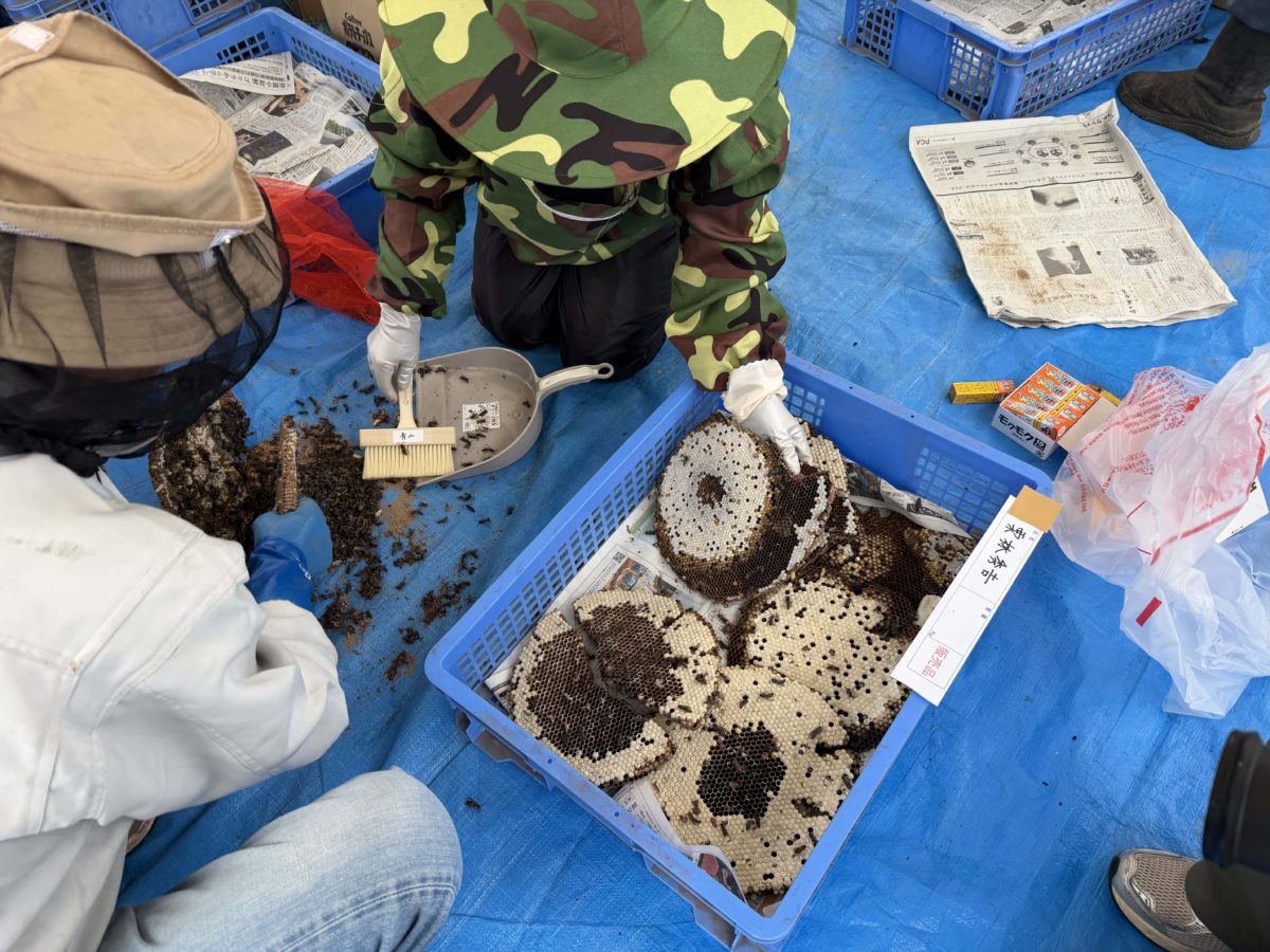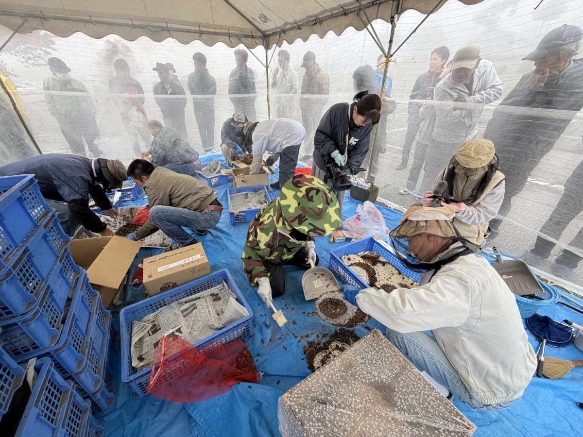開会式の後に、ネットを張ったテントの中で、地蜂の巣の解体作業が始まりました。巣の入った段ボール箱に穴をあけ、発煙筒を入れて煙幕で蜂を気絶させた上で蜂の巣を取り出し、巣を各層に分解します。