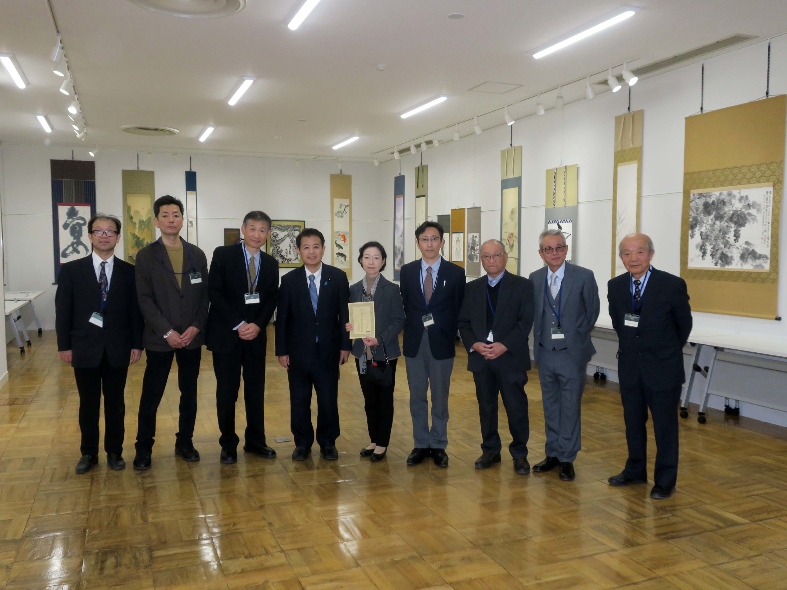 写真は、表装作品展を主催された飯田表具経師内装協会の皆様との記念写真です。
