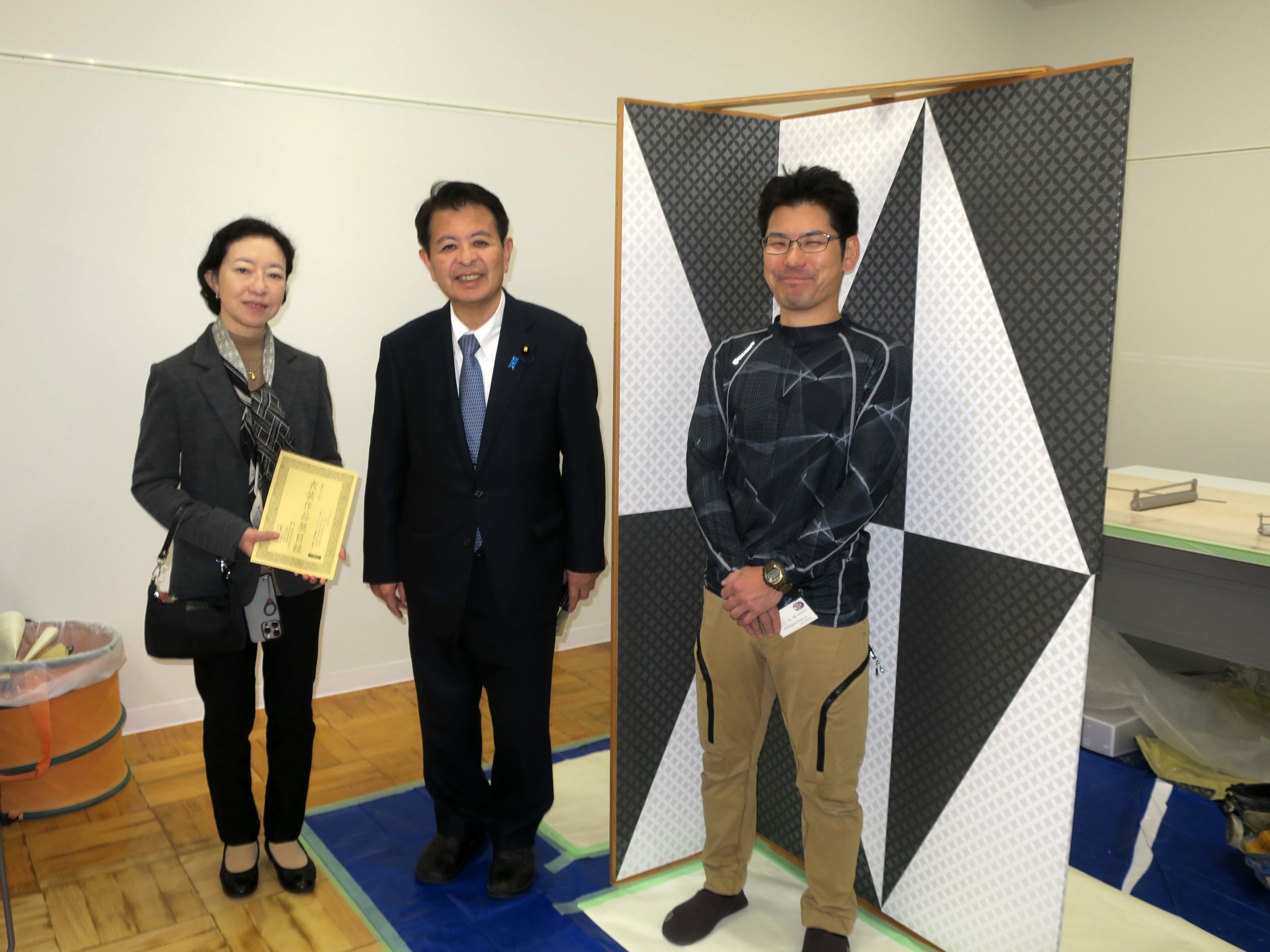 表装作品展の会場では、来年2月の技能グランプリでの壁装競技に出場される予定の「室内装飾 林屋」の林聖之(としゆき)さんから、競技の仕組みや技術的に難しい点などについてのお話を伺うことが出来ました。練習の成果を十分に発揮されるよう、お祈りします!