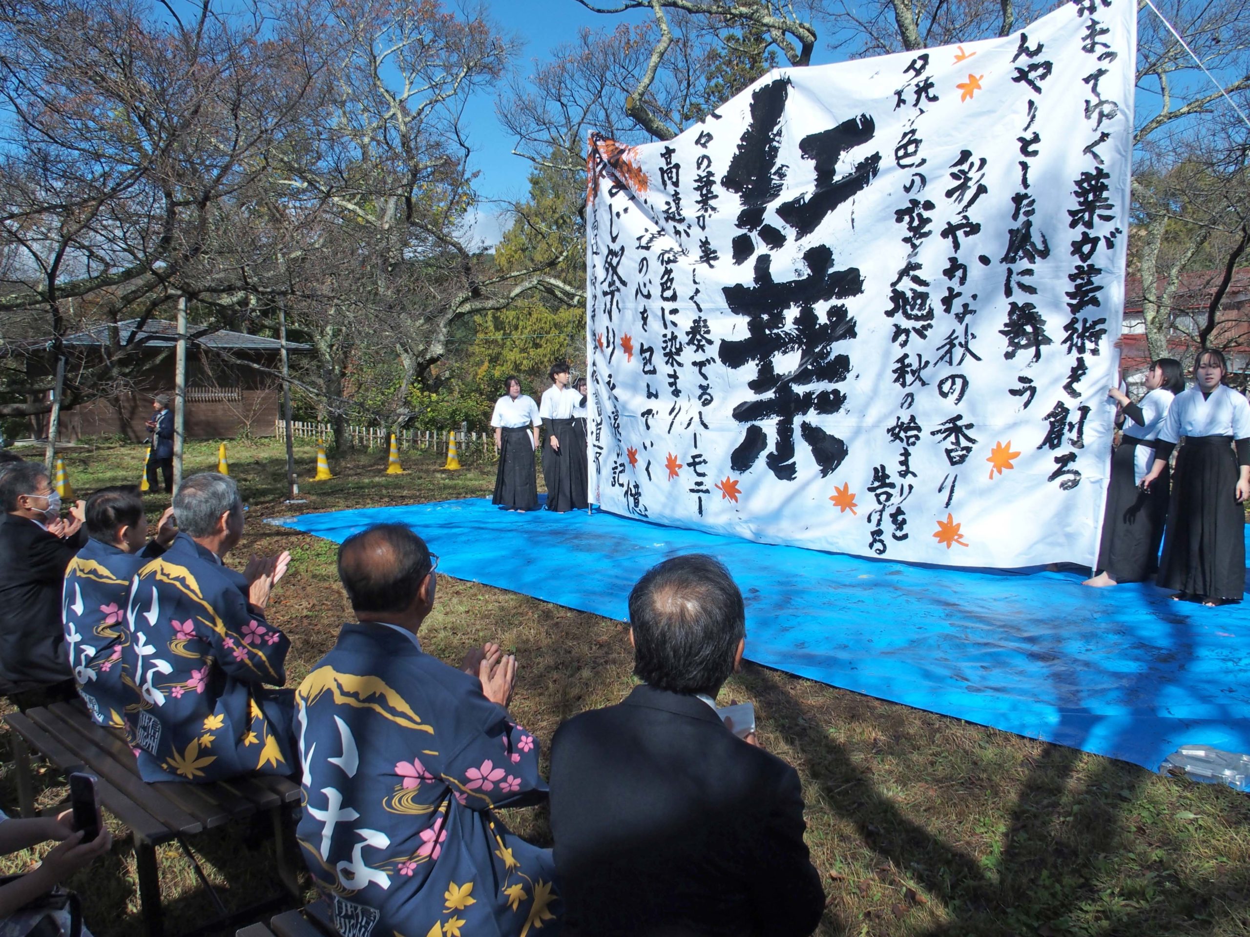 アトラクションとして、高遠高等学校書道部の皆さんによる書道パフォーマンスが行われ、紅葉をテーマとした見事な作品が出来上がりました。