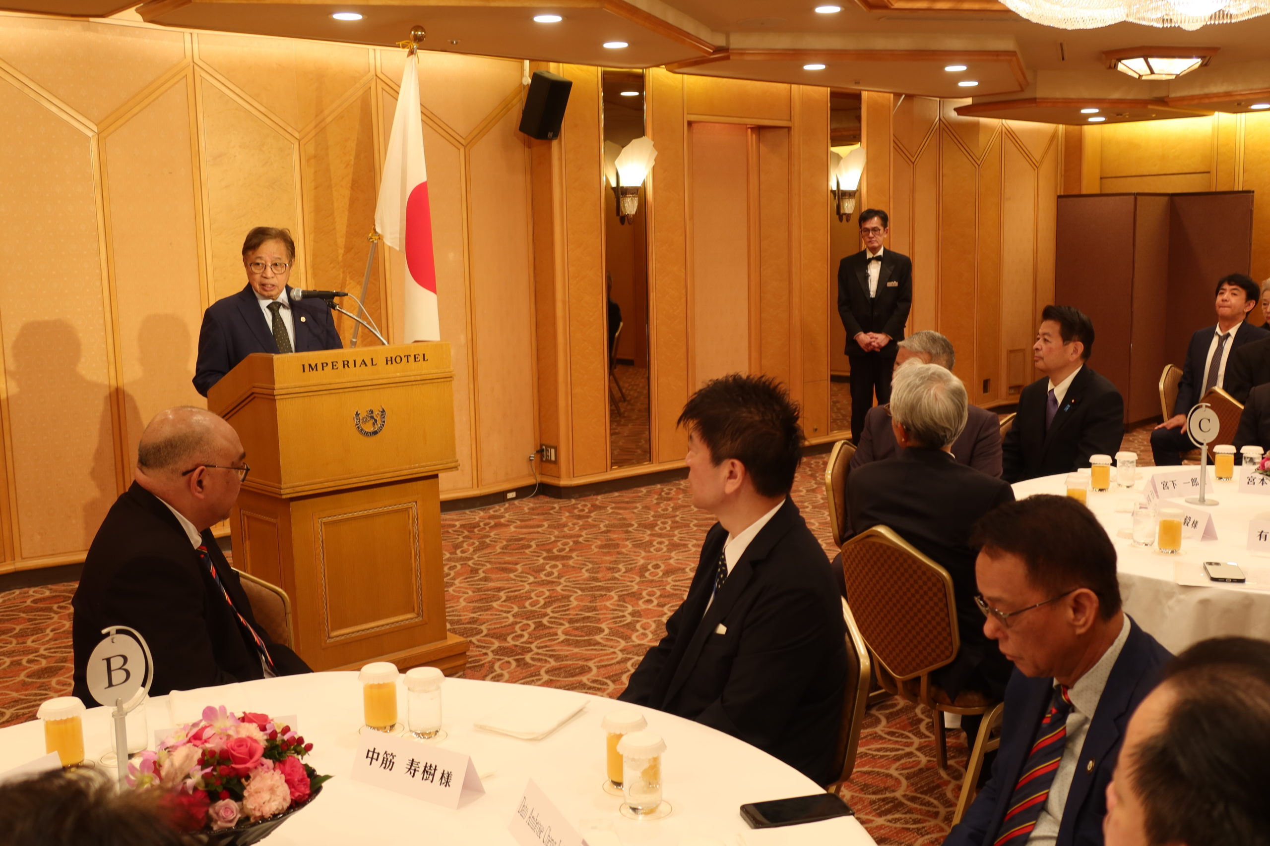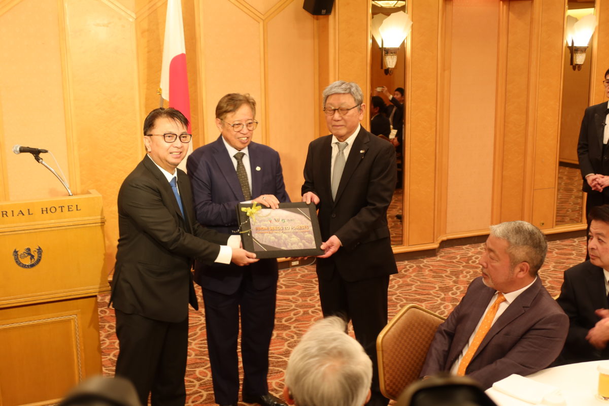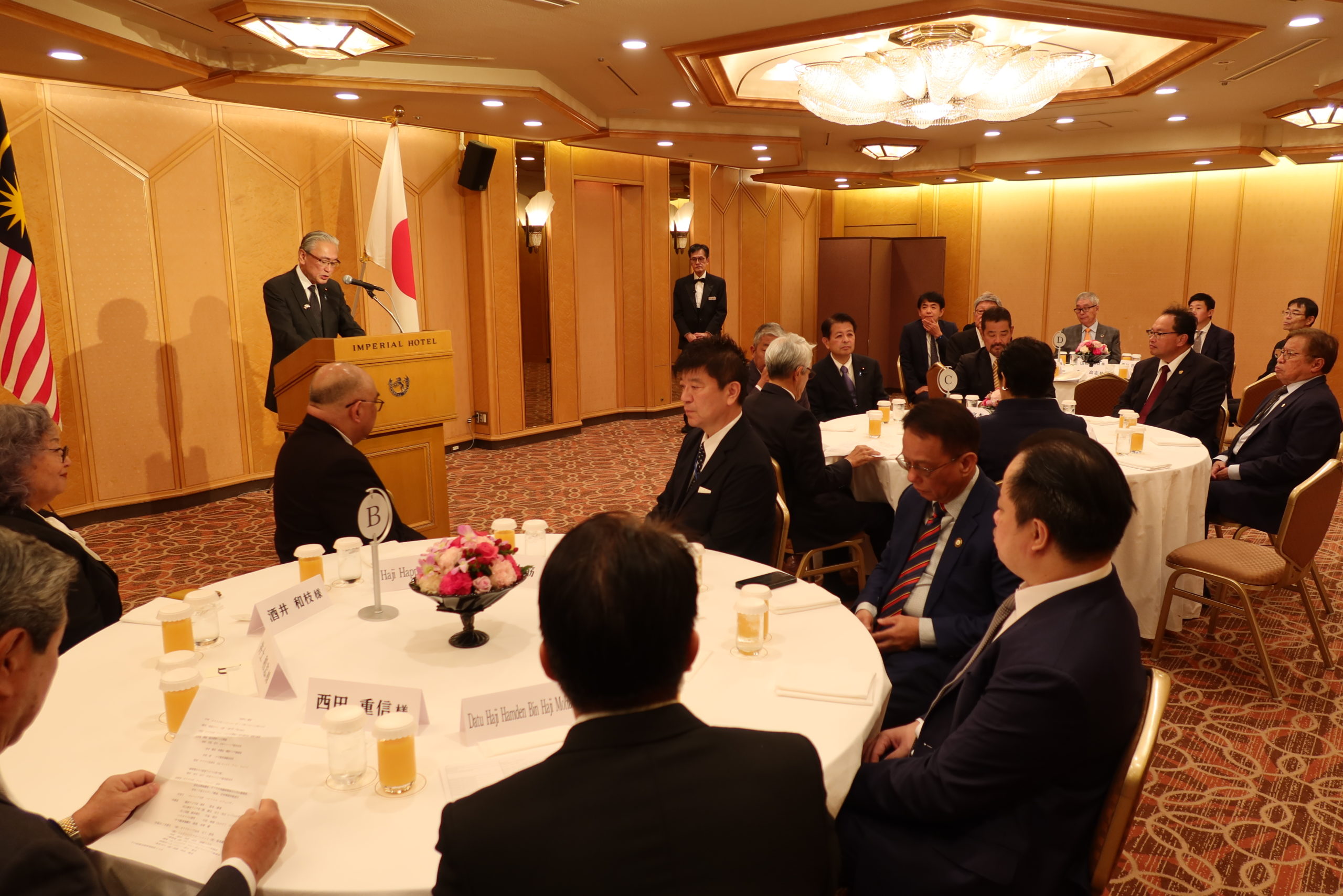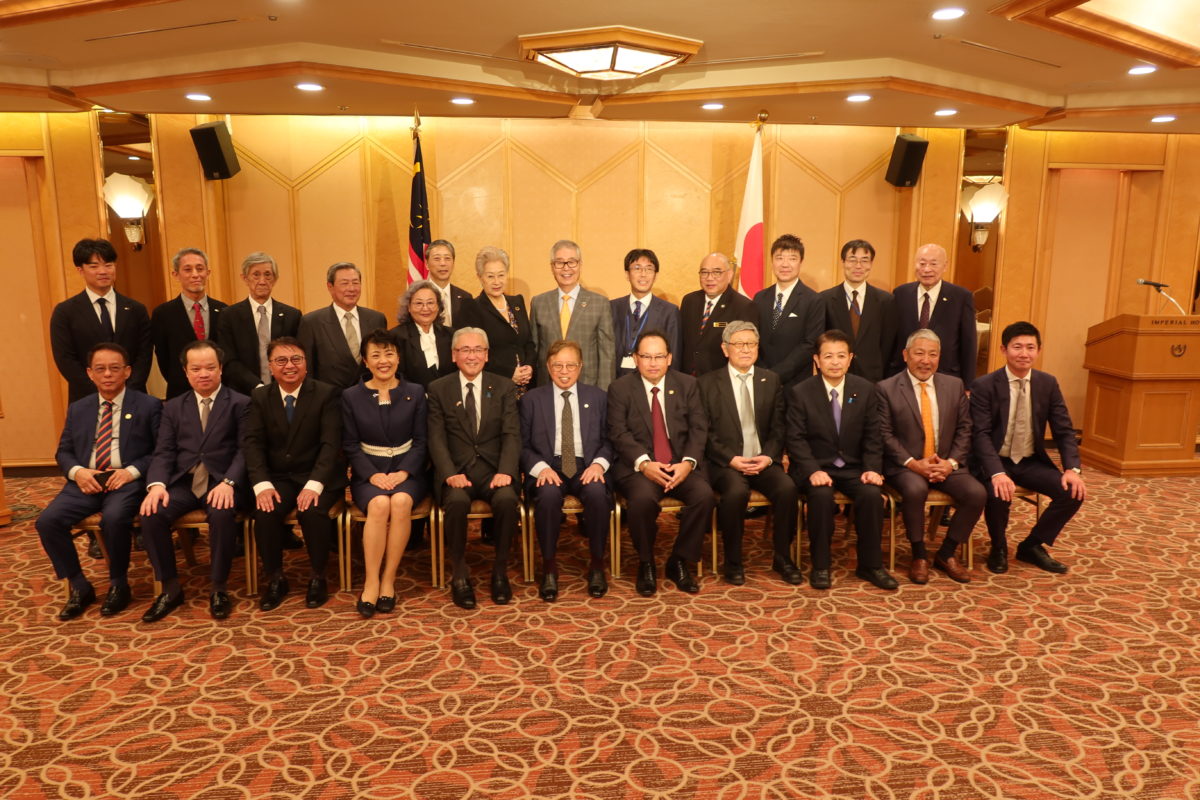 はじめに、日本マレーシア協会の古屋圭司会長から、アバンジョハリ首相がこれまで、日本マレーシア協会が進めるサラワク州での熱帯雨林再生事業に長きにわたりご支援を頂いたこと、また日本とマレーシアの友好関係強化に多大なご貢献を頂いたことに敬意と感謝を表し、叙勲受章の御祝いのご挨拶がありました。