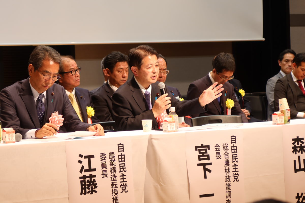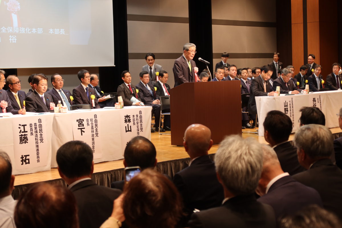 出席の自民党国会議員を代表して私から、総合農林政策調査会長としての取組をご報告申し上げるとともに、様々な現場の課題解決に向けた農業構造転換の集中対策に向けて力を尽くしていくことをお誓いしご挨拶申し上げました。