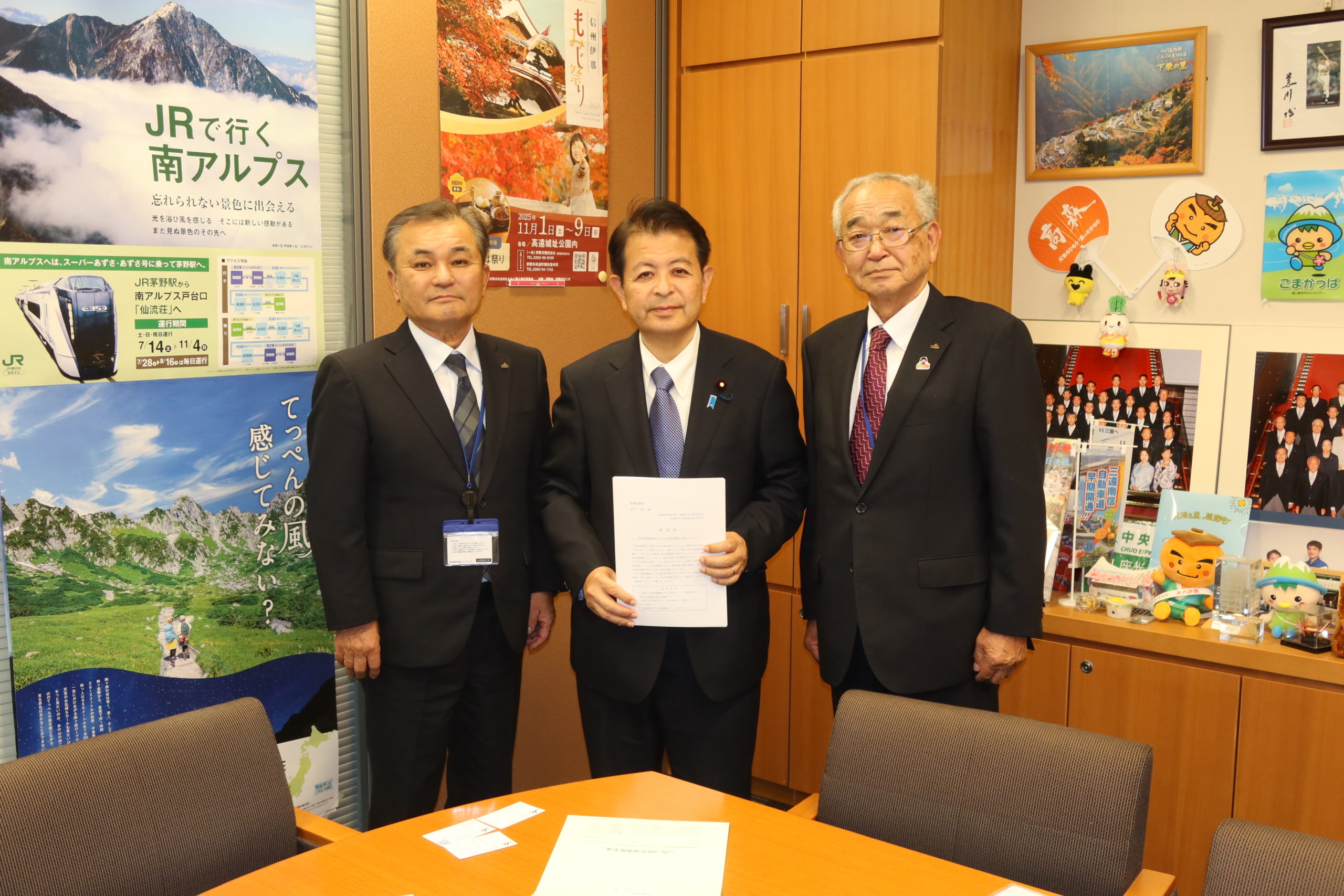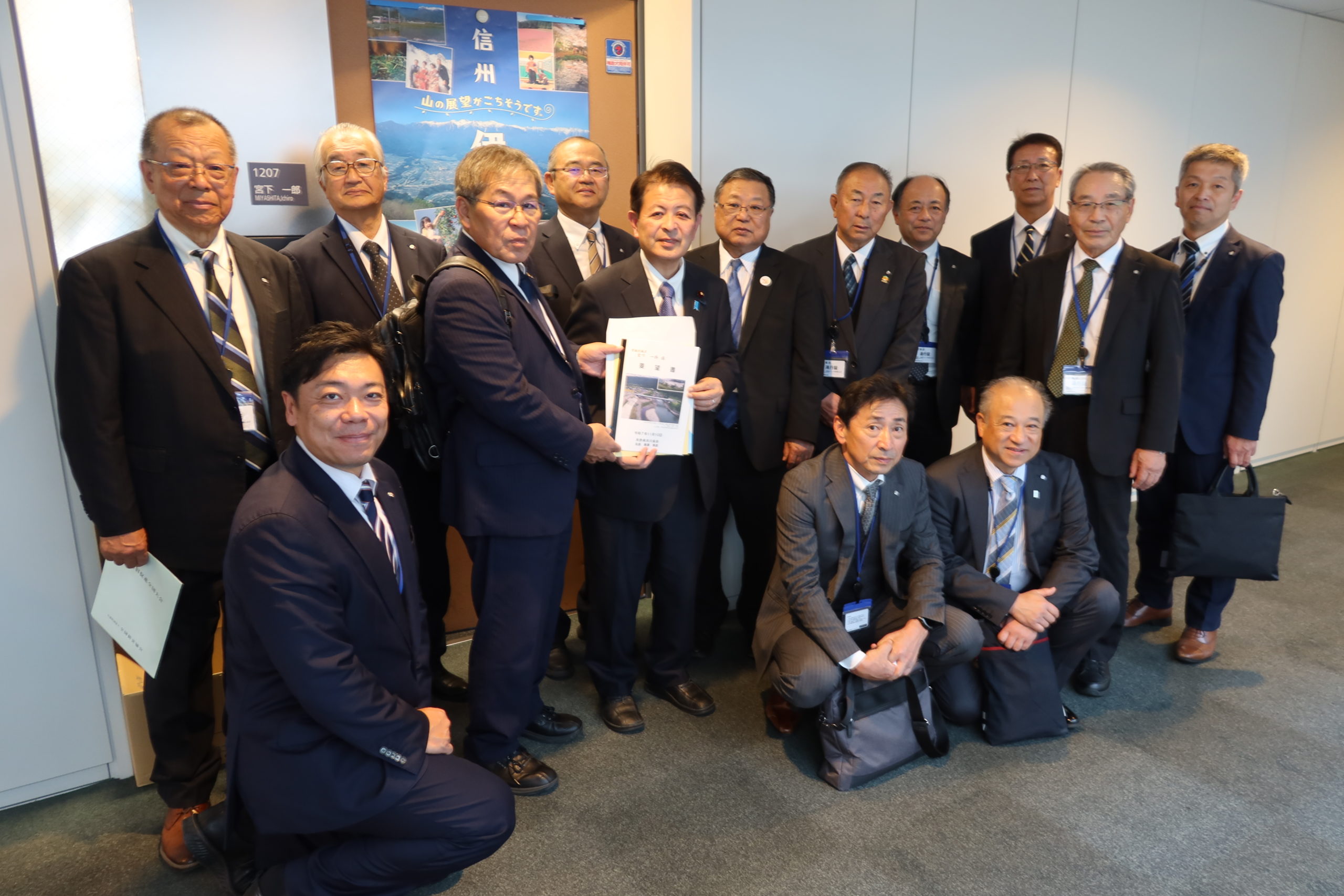 午後3時過ぎには、地元の町村長の皆様がお見えになり、長野県河川協会による「防災・減災、国土強靭化による治水対策の推進に関する要望書」並びに、災害復旧促進全国大会で決議された「災害復旧促進に関する決議書」を頂きました。