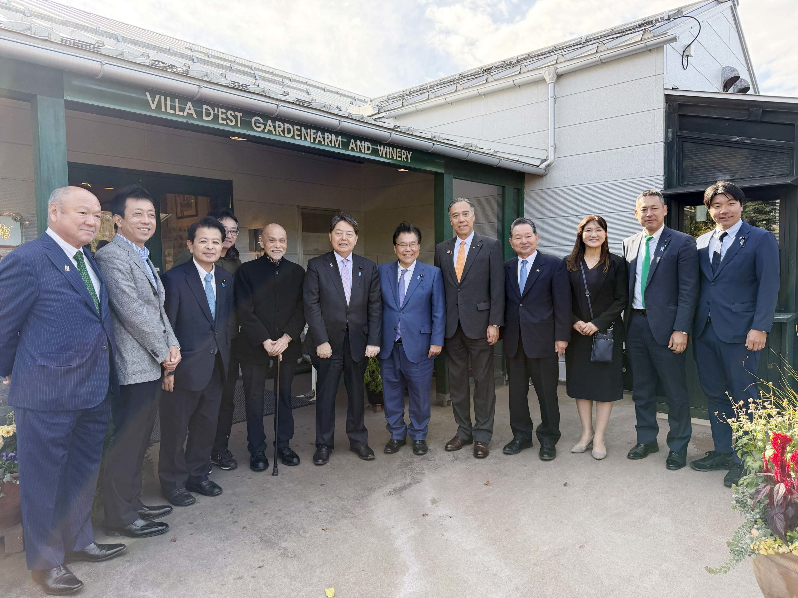 ヴィラデストワイナリーの入り口で、玉村豊男さんを囲んで記念撮影が行われました。