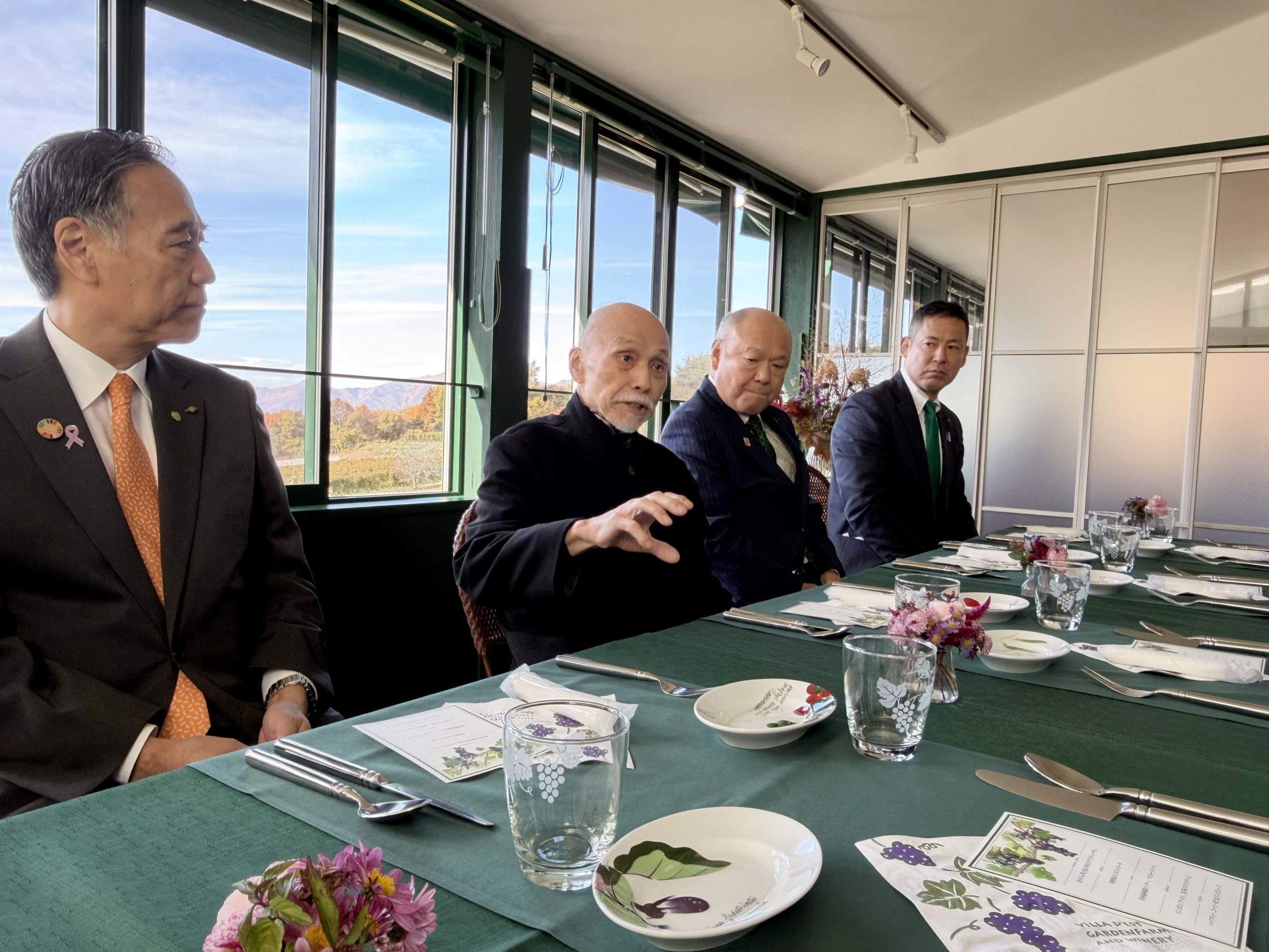 視察参加者の皆さまとの昼食会では、玉村豊男さんから、桑畑だったこの地でワイン用ブドウの栽培をはじめてからの取り組みについてお話を伺いました。玉村さんは、ワイナリー経営を学ぶ学校を開設され、これまで約240名が卒業し、全国で多くのワイナリーが開設されているそうです。ヴィラデストワイナリーが設立されたのは2003年ですが、22年たった現在では、当地域でも92のワイナリーに増えているとのことです。