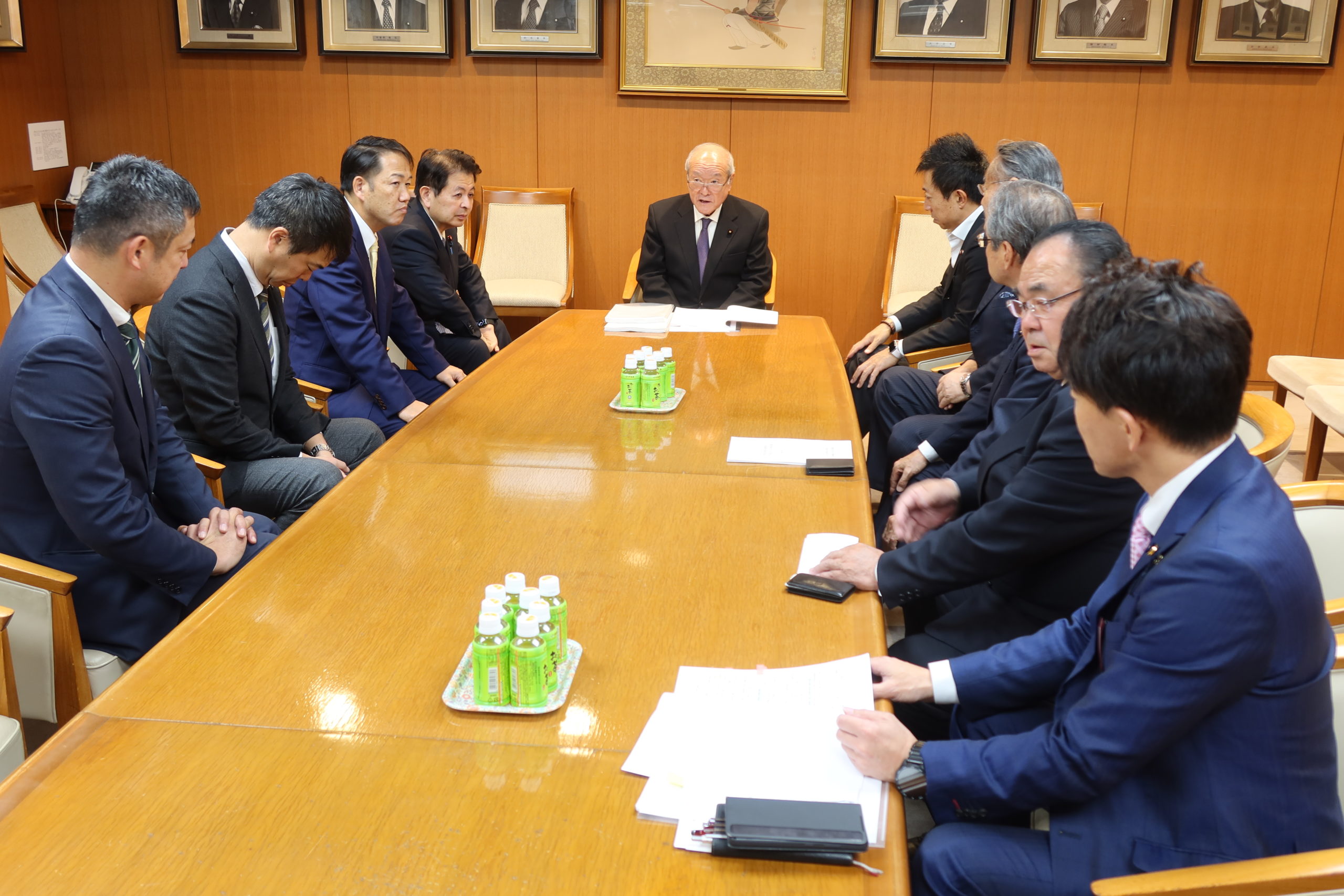 午後2時30分前には、下條村の金田憲治村長と過疎法適用外小規模町村連絡協議会共同代表の山本進北海道東神楽町長をはじめとする皆様から「過疎法の適用外町村への支援」に関する要請書を頂きました。