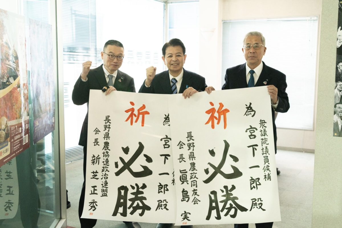 午前8時には、長野県農政同友会の眞島実会長、長野県農協連政治連盟の新芝正秀会長から、激励の必勝為書きを頂きました。