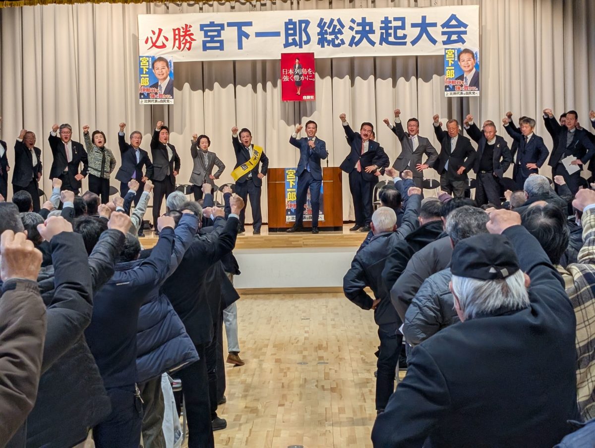 「伊那谷を強く豊かに」する強い決意と覚悟を申し上げ、皆さまのお力で宮下一郎を押し上げて頂くようお願いをし、必勝に向けてのガンバローコールで心を一つにしました。